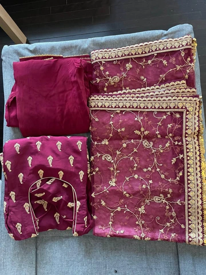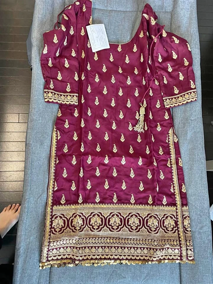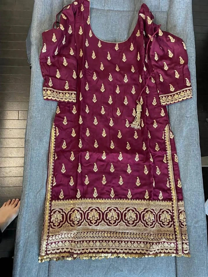 Stunning maroon 3-piece Indian suit set. Features a beautiful kurta with gold embroidery and sequins, matching plain pants, and a sheer dupatta with gold embroidery and sequin border. Perfect for parties or special events. Measurements: L (Length): 40, C (Chest): 19½, W (Waist): 17½, H (Hip): 20, B (Biceps): 19. Plazo Length: 40, Plazo Hip: 39½, Plazo Waist: 30.