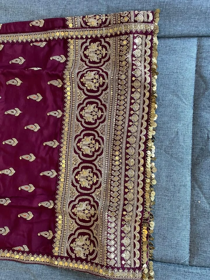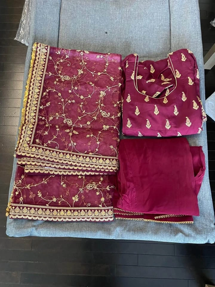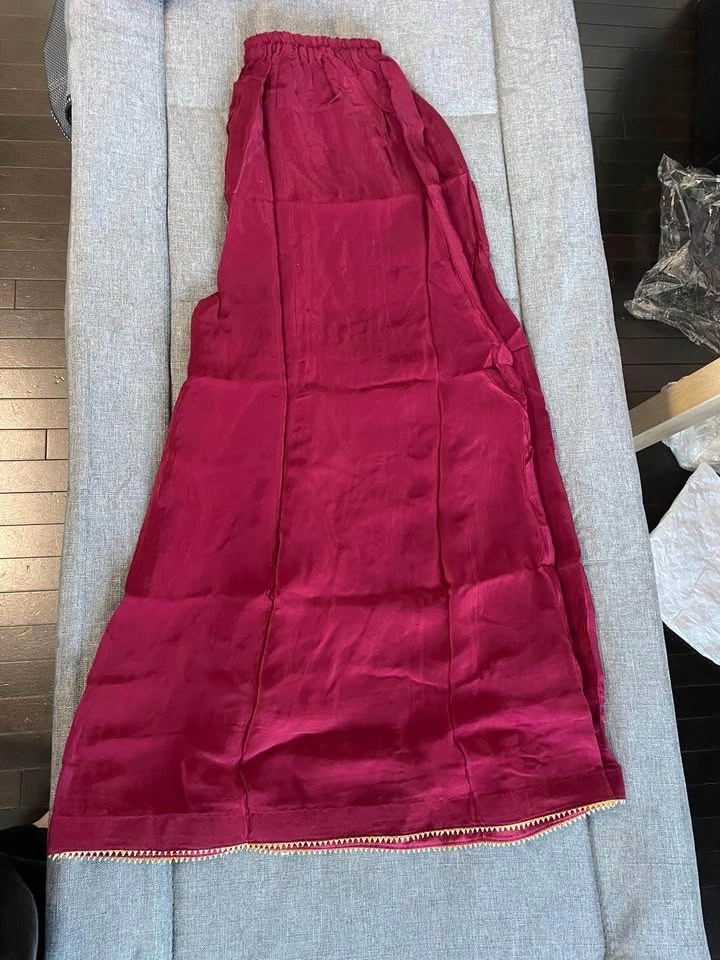 Stunning maroon 3-piece Indian suit set. Features a beautiful kurta with gold embroidery and sequins, matching plain pants, and a sheer dupatta with gold embroidery and sequin border. Perfect for parties or special events. Measurements: L (Length): 40, C (Chest): 19½, W (Waist): 17½, H (Hip): 20, B (Biceps): 19. Plazo Length: 40, Plazo Hip: 39½, Plazo Waist: 30.