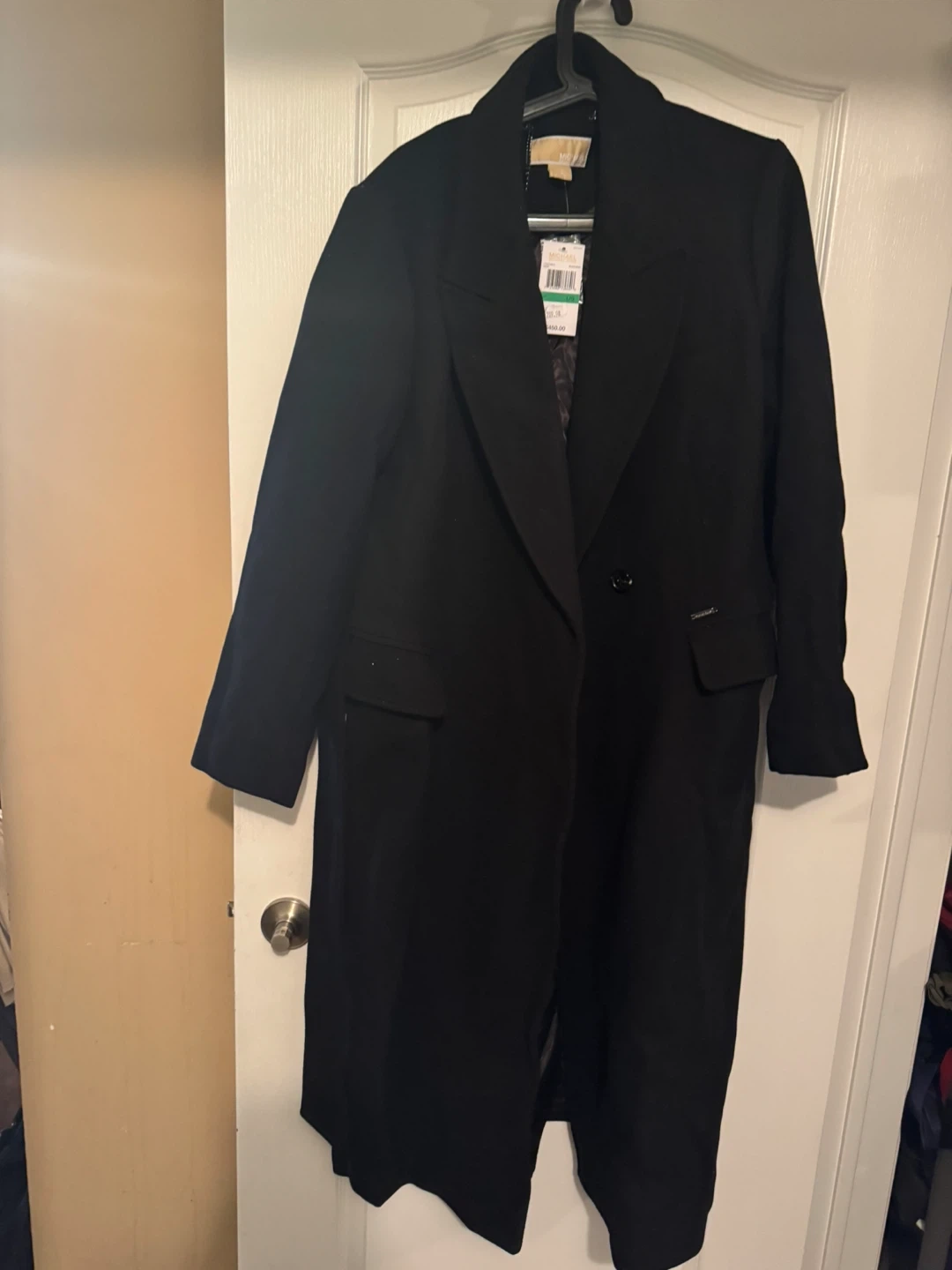 This Michael Kors coat is a timeless black wool blend, perfect for cooler weather. It features a classic notched lapel and single-button closure. This piece is a size medium.