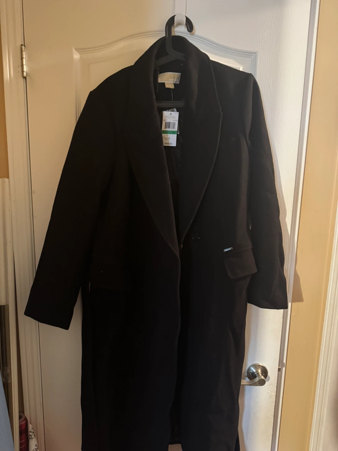 This Michael Kors coat is a timeless black wool blend, perfect for cooler weather. It features a classic notched lapel and single-button closure. This piece is a size medium.