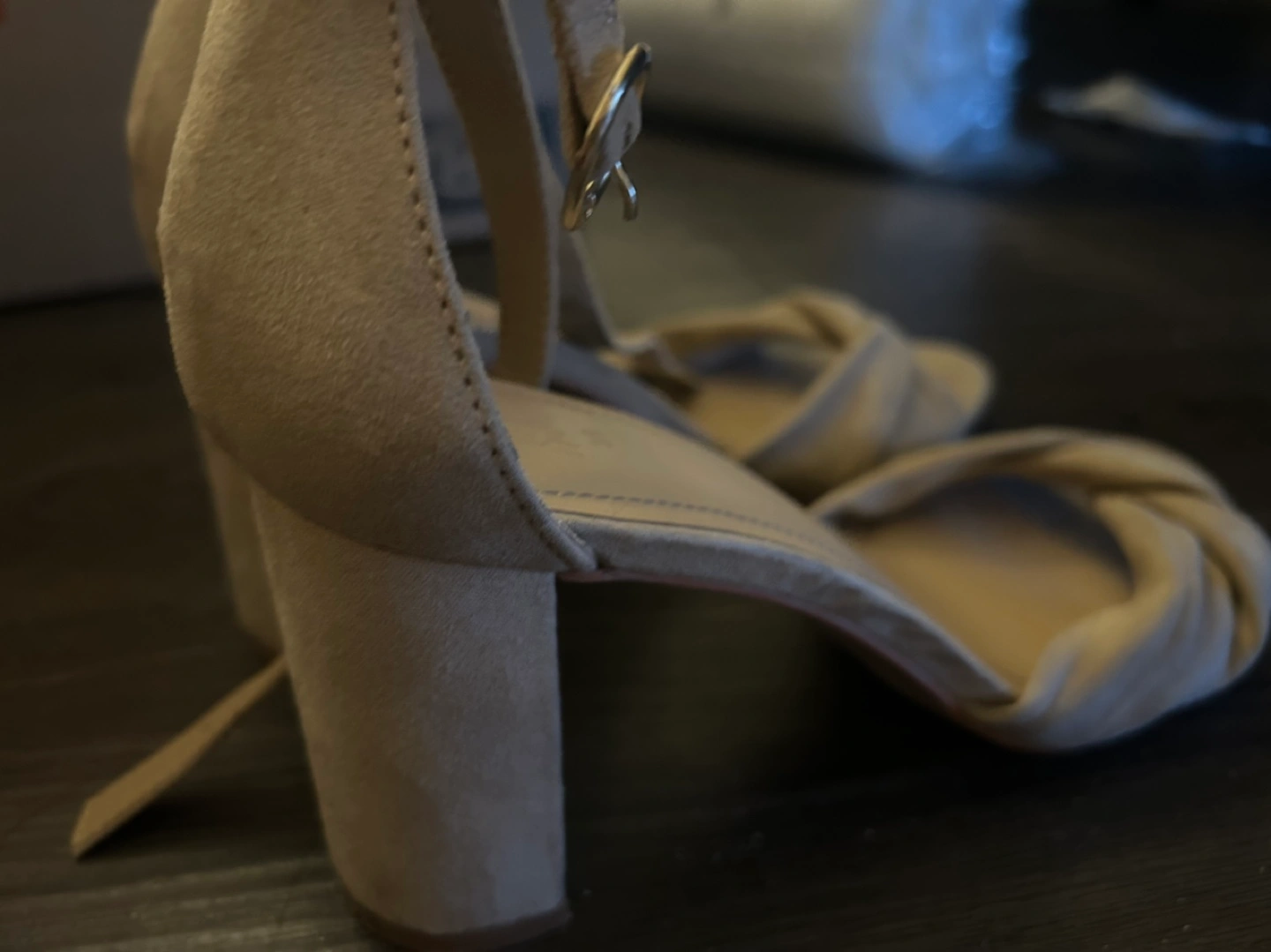 Pair of beige suede heeled sandals. Ankle strap with buckle closure. Twisted detail at toe.