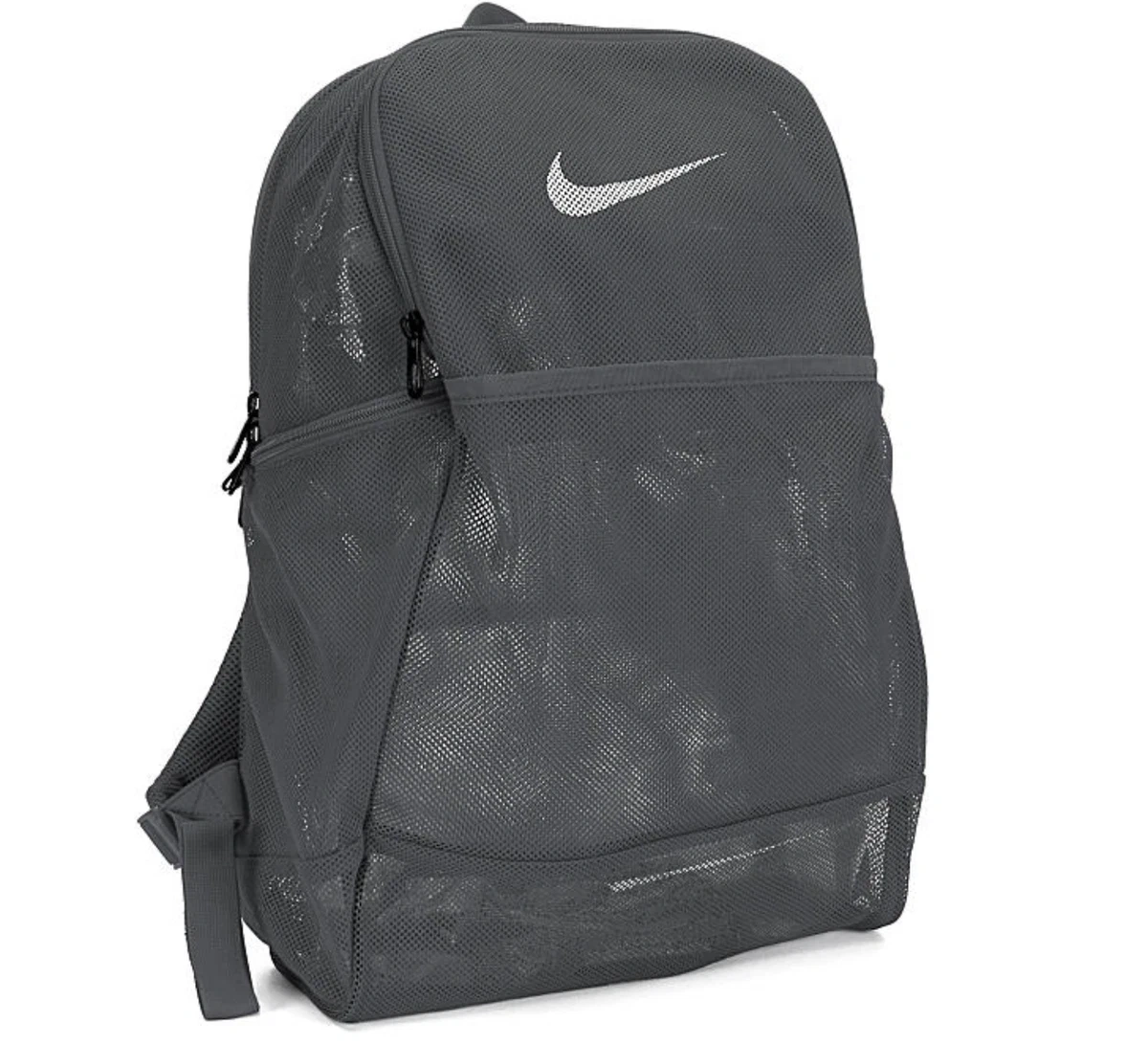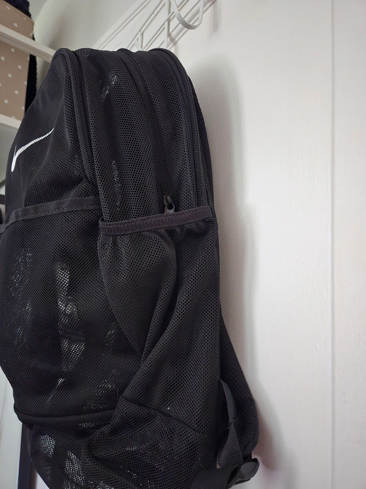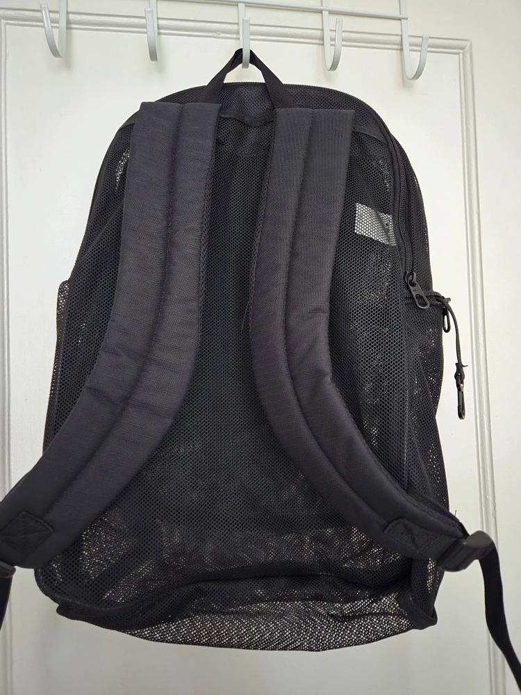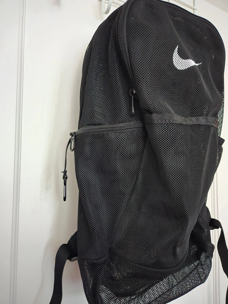 Nike black mesh backpack. Features padded straps. A zipper closure. Makes a great bag for anything from school to the gym.