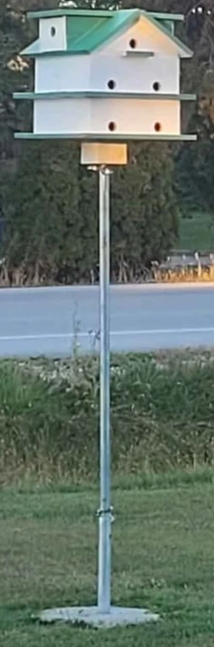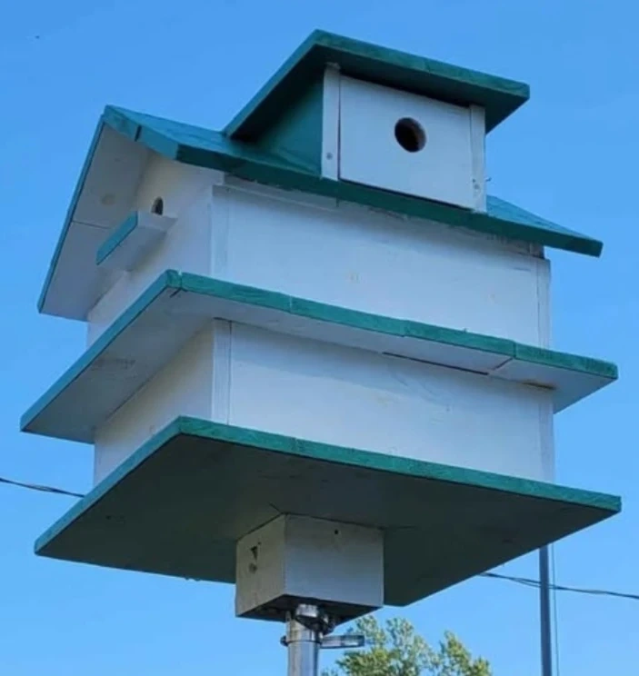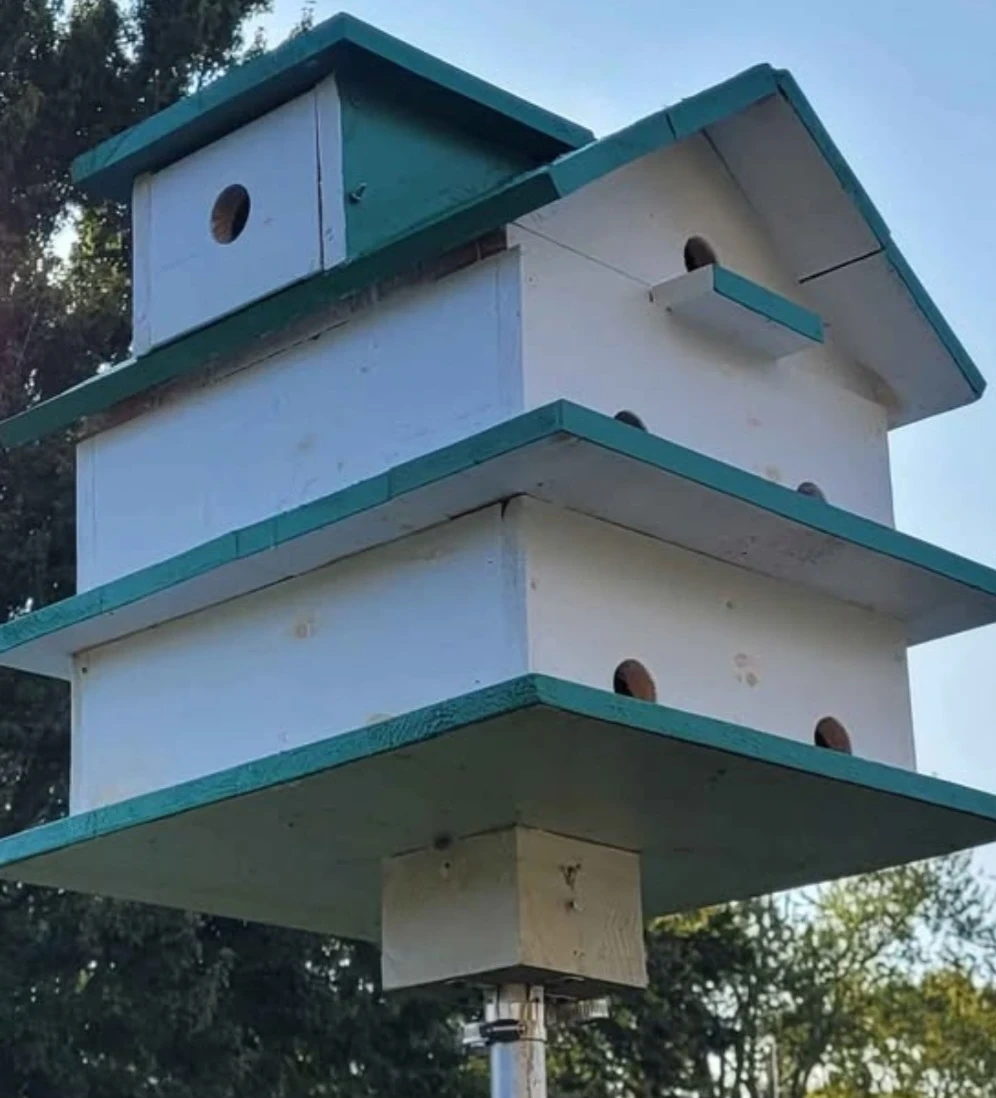 A charming three-tiered birdhouse with a green roof and white body. Multiple openings for Purple Martins π