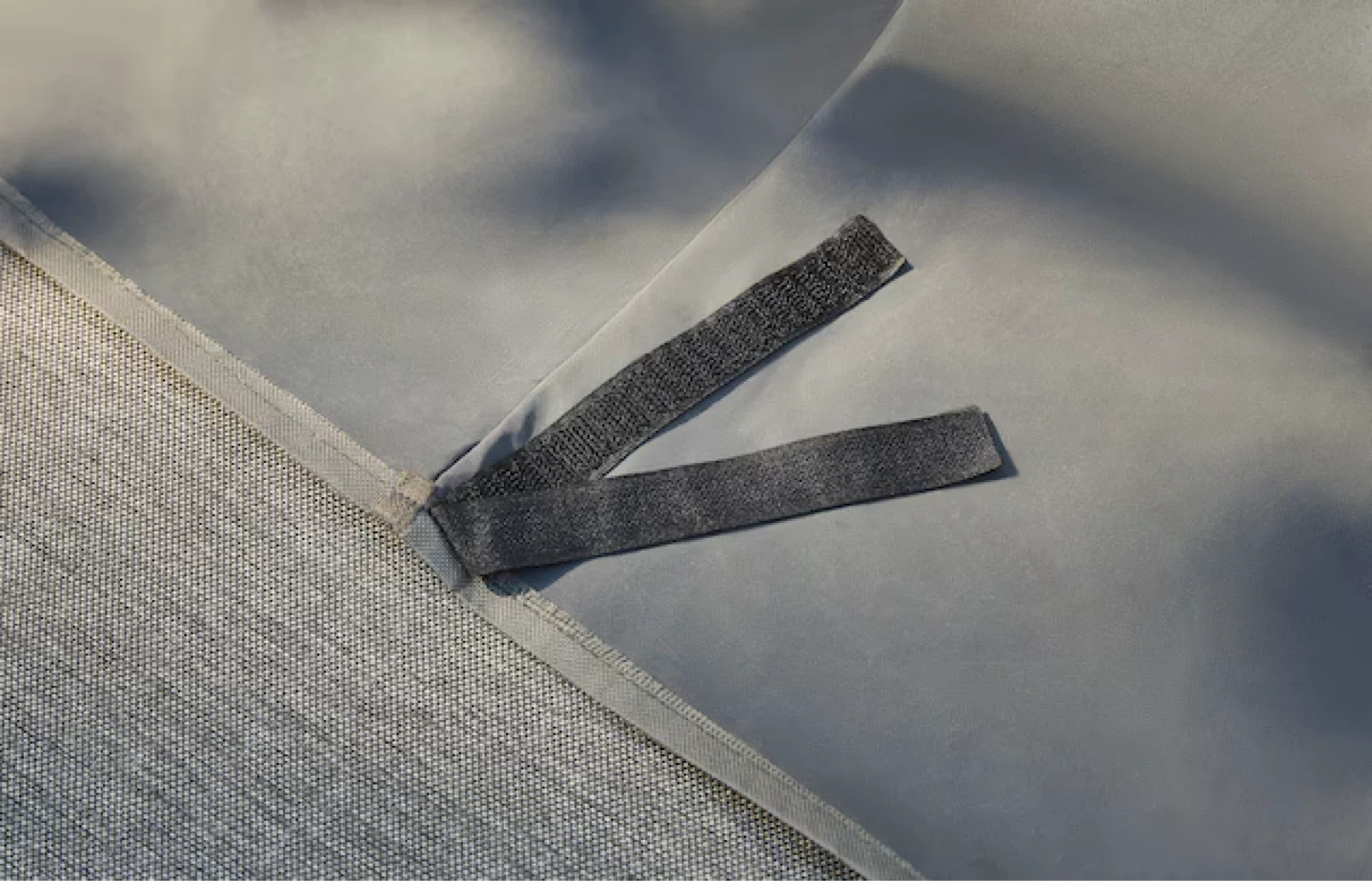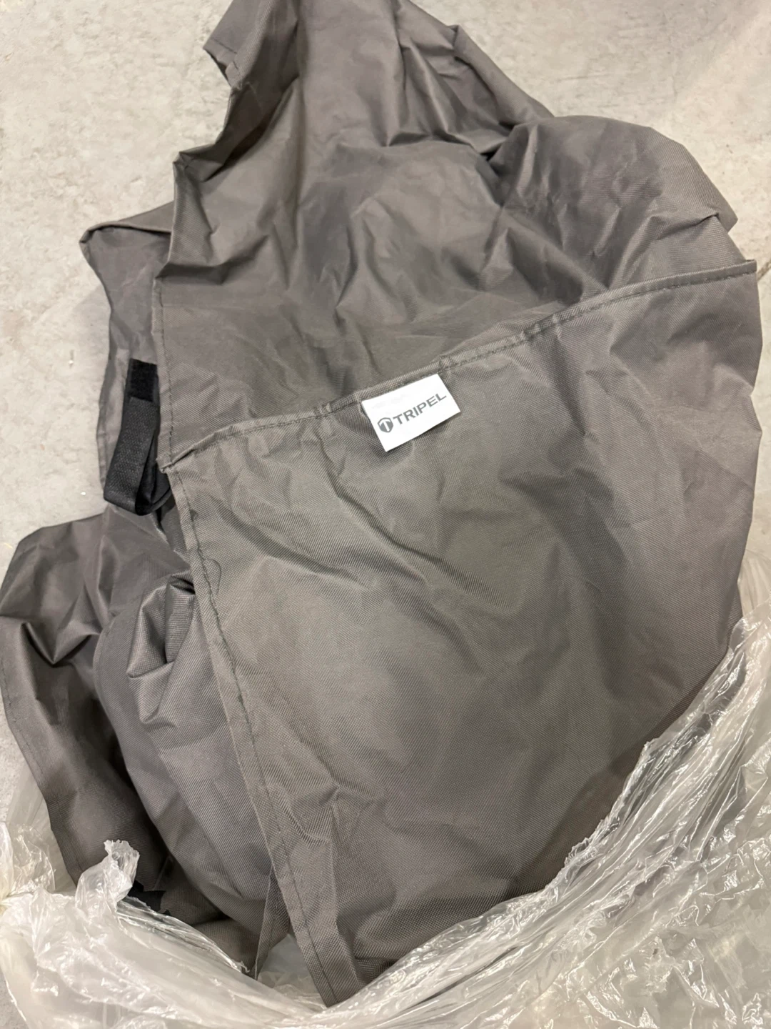 Never used. Protect your outdoor furniture with this grey chair cover from TRIPEL. It's made from durable material and includes securing straps. Ideal for keeping chairs clean and dry when not in use!