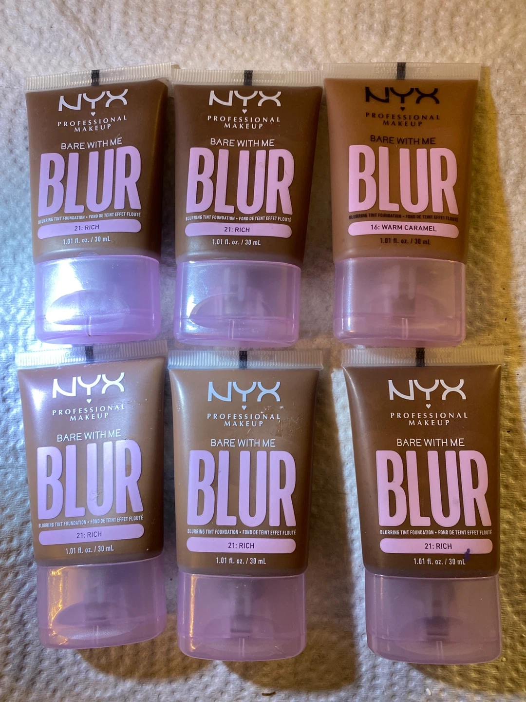 NYX Professional Makeup Bare With Me Blur Tint Foundation. Includes four tubes of shade 21: Rich and two tubes of shade 16: Warm Caramel. Each tube is 1.01 fl. oz. / 30 mL.