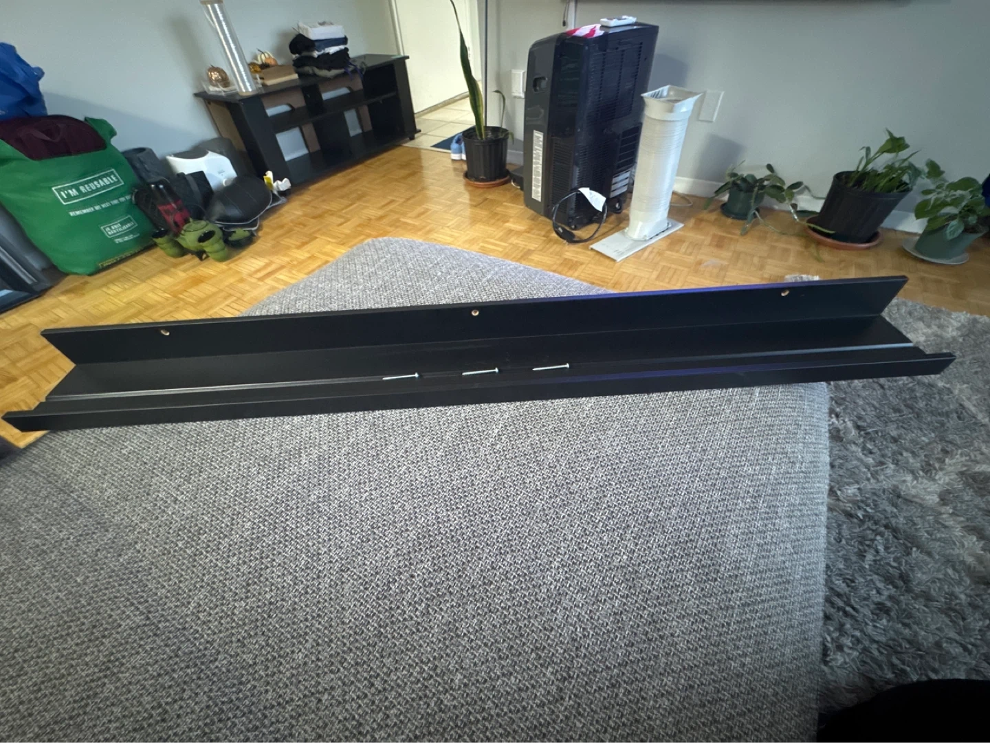 This is an IKEA MOSSLANDA picture ledge in black. It's 115cm in length and perfect for displaying photos and small decor items. Easy to mount on the wall!