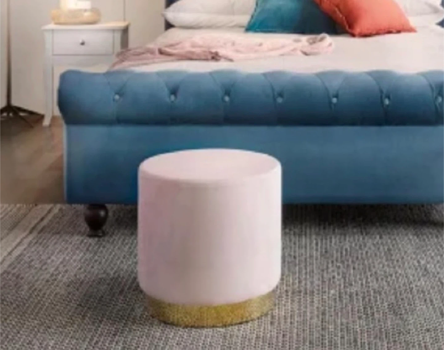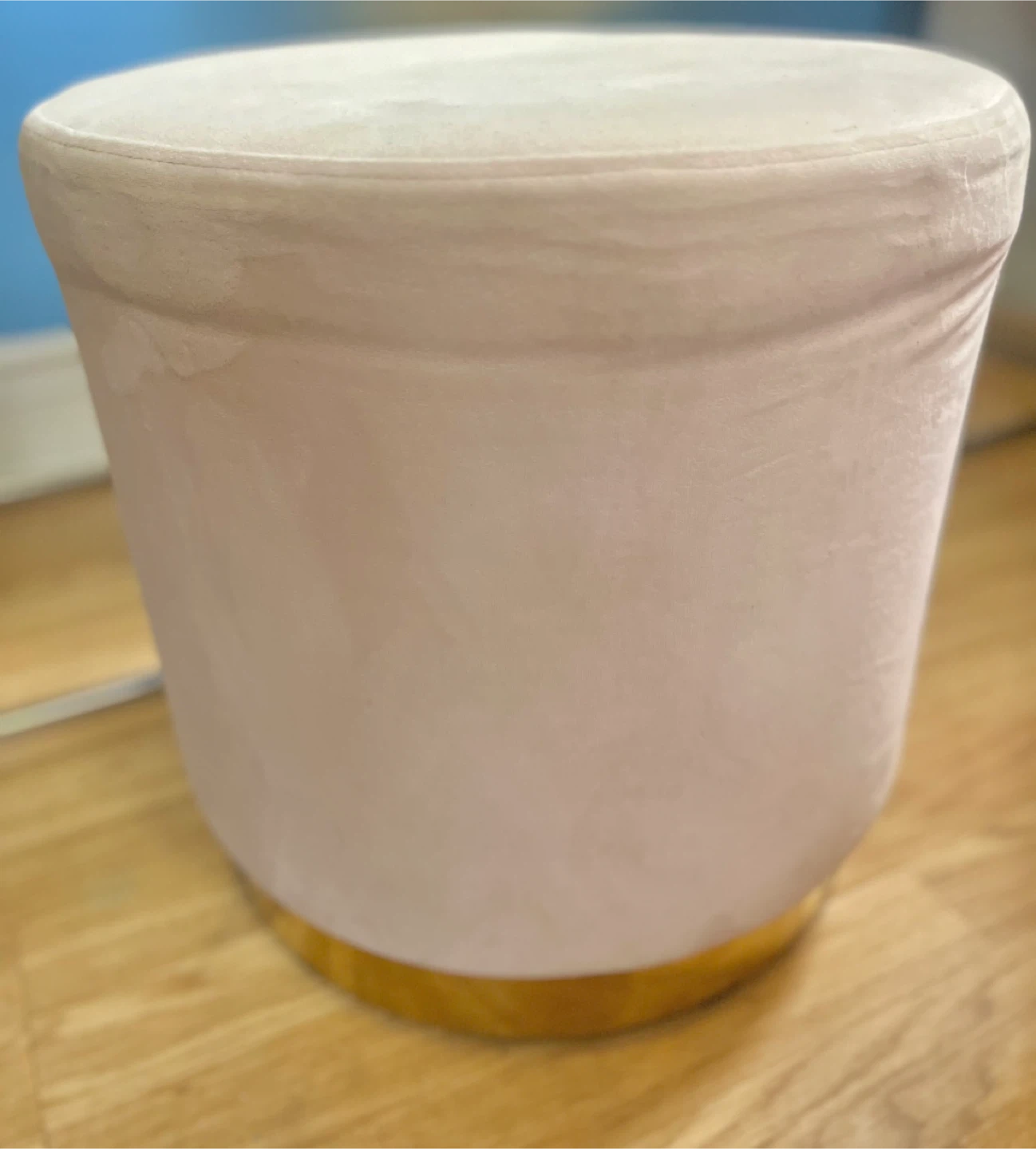 Structube Keira velvet ottoman in a soft pink colour. It features a gold-toned base. This ottoman adds a touch of style to any room.