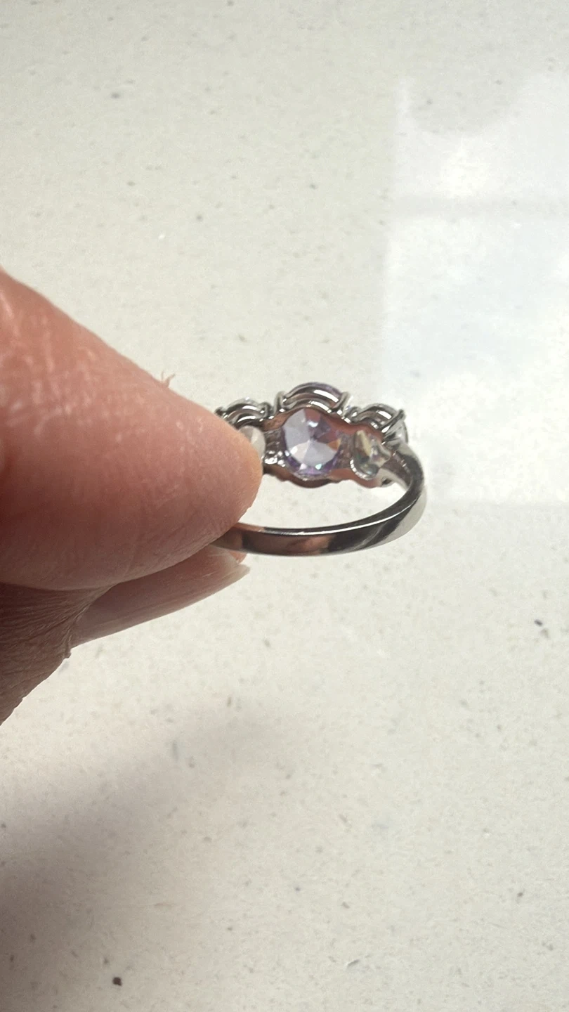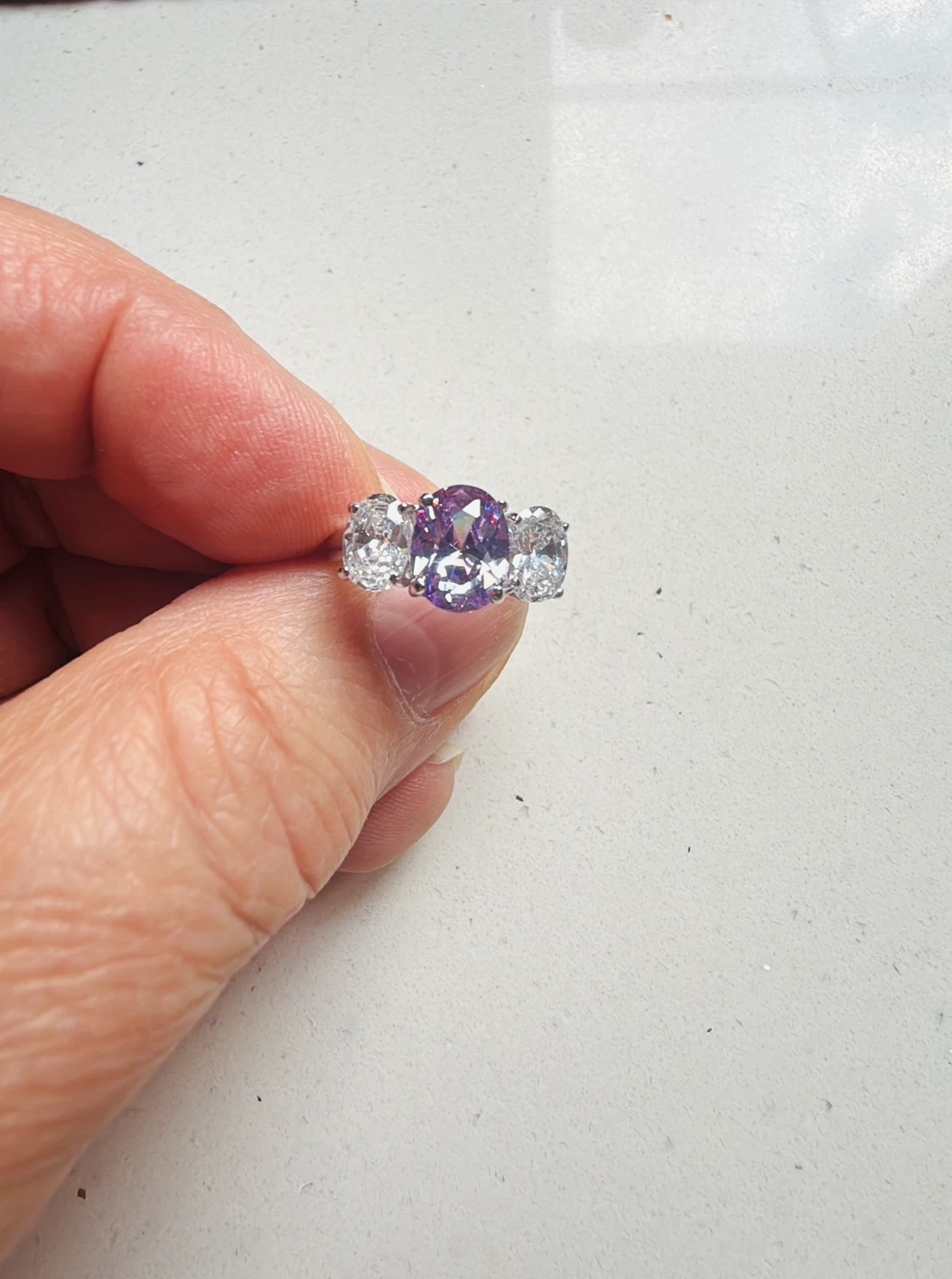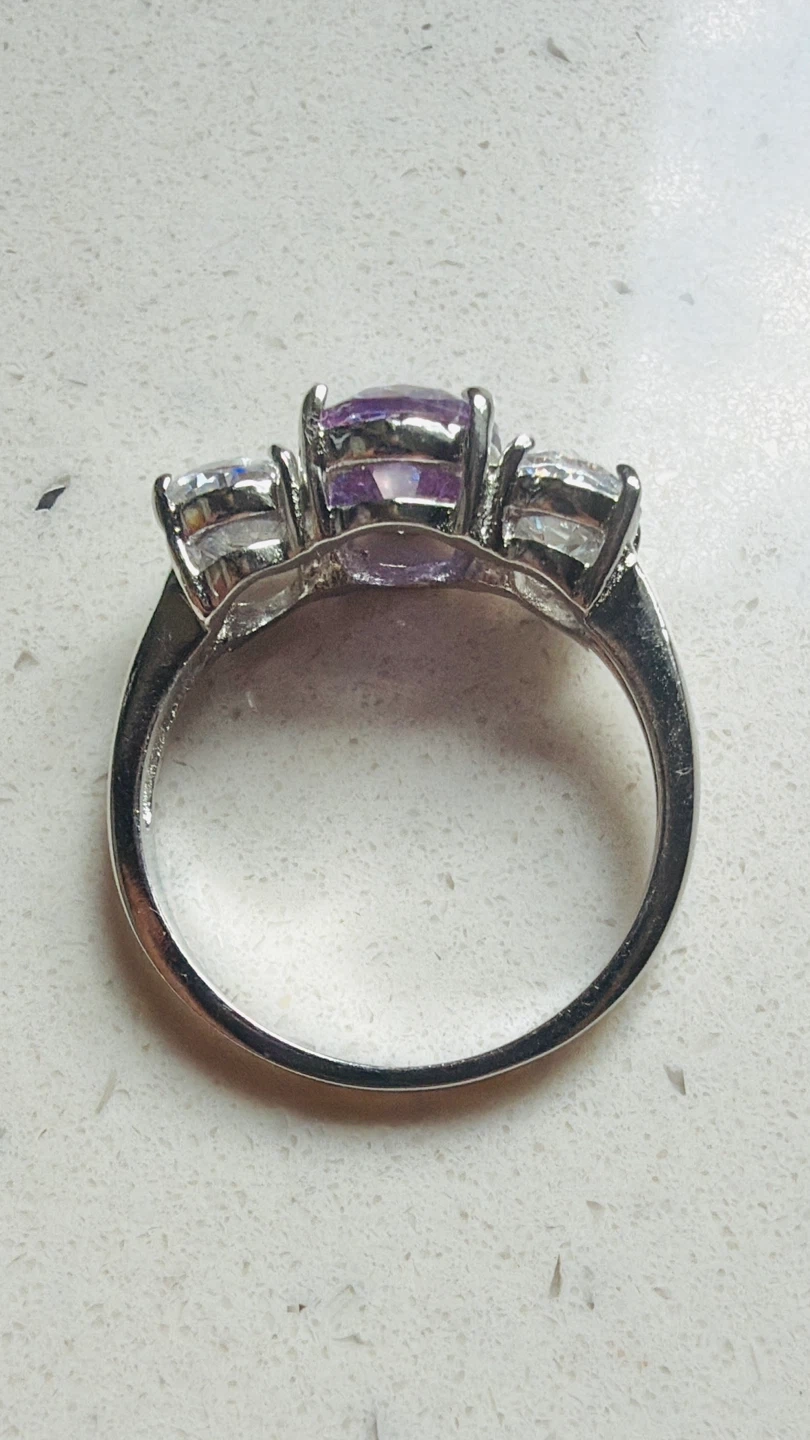 This three-stone ring features a central oval amethyst with two smaller oval Crystals. It's crafted from 925 sterling silver. This ring is a lovely choice for adding a touch of lavender to any outfit.