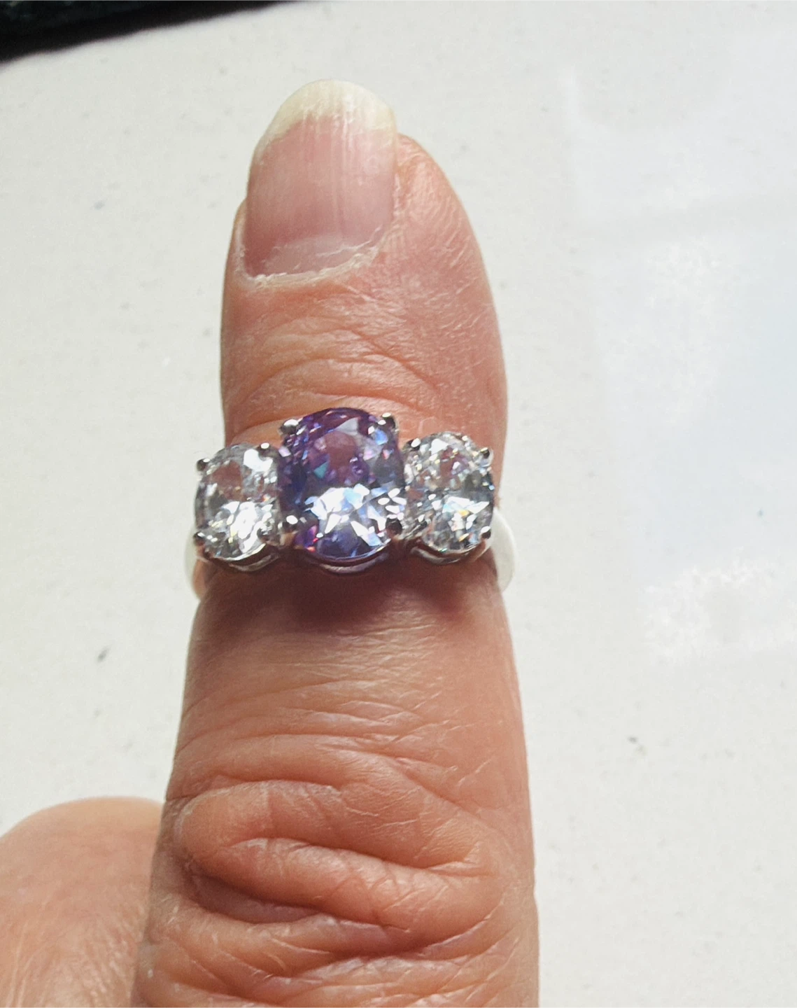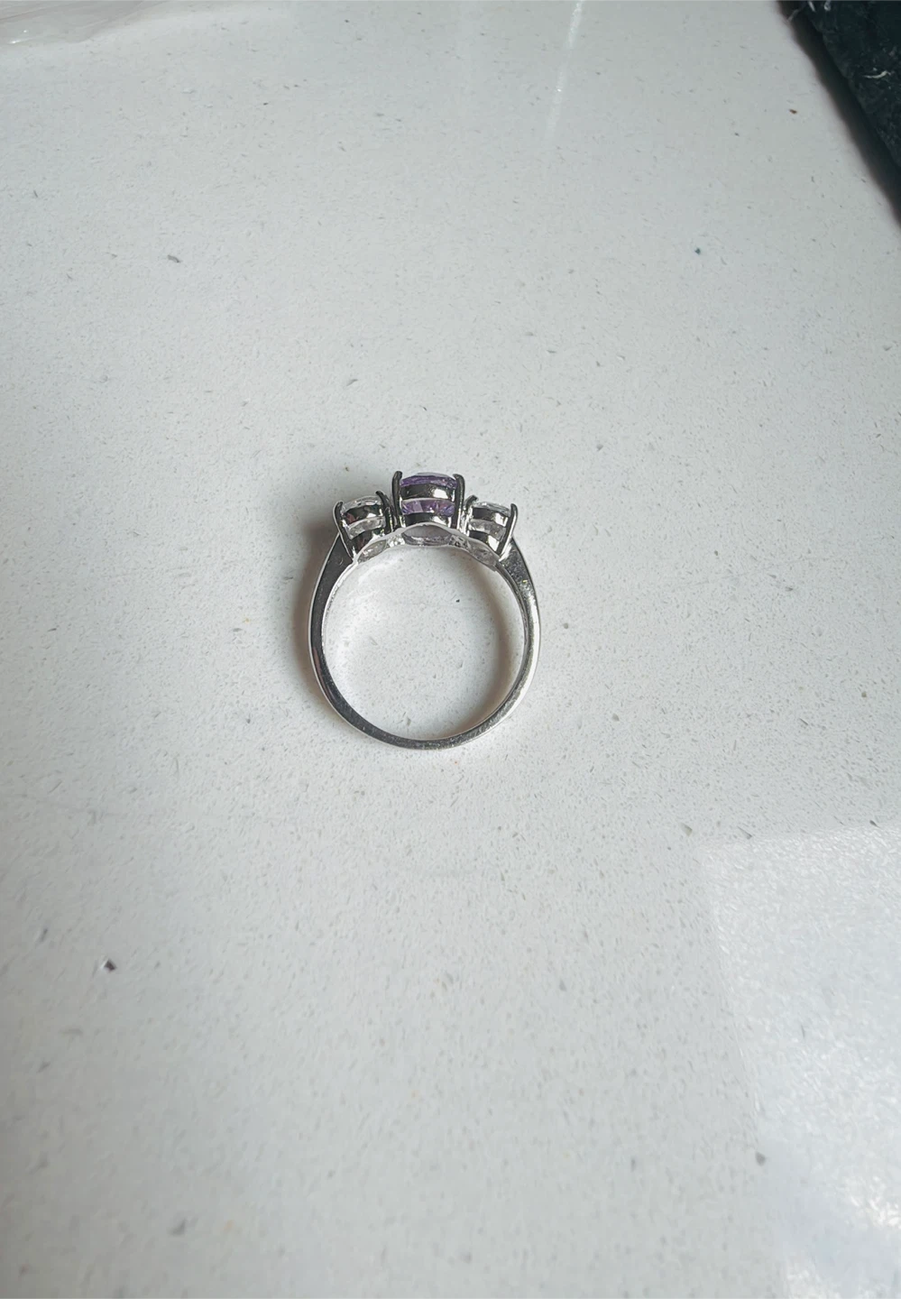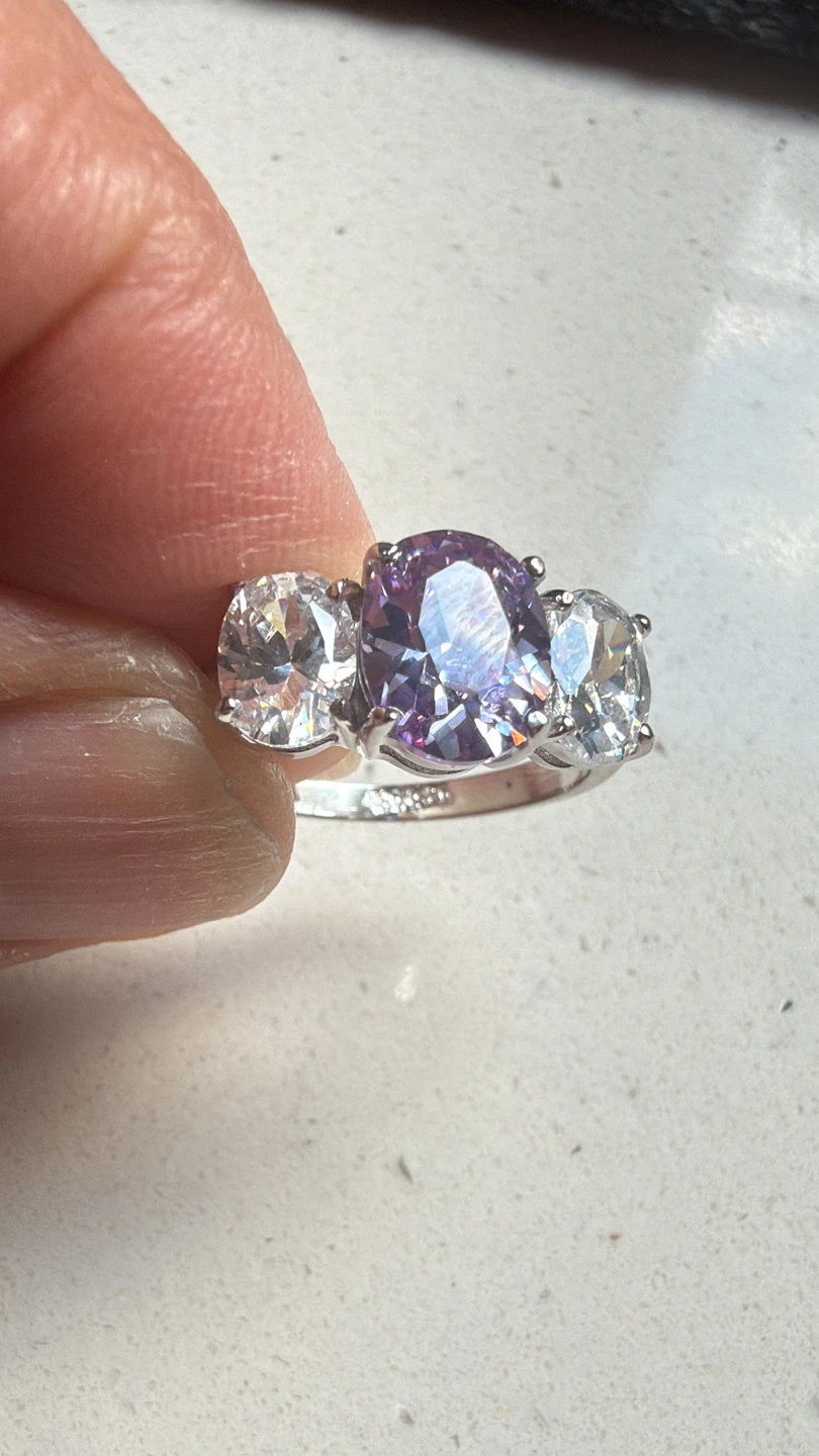 This three-stone ring features a central oval amethyst with two smaller oval Crystals. It's crafted from 925 sterling silver. This ring is a lovely choice for adding a touch of lavender to any outfit.