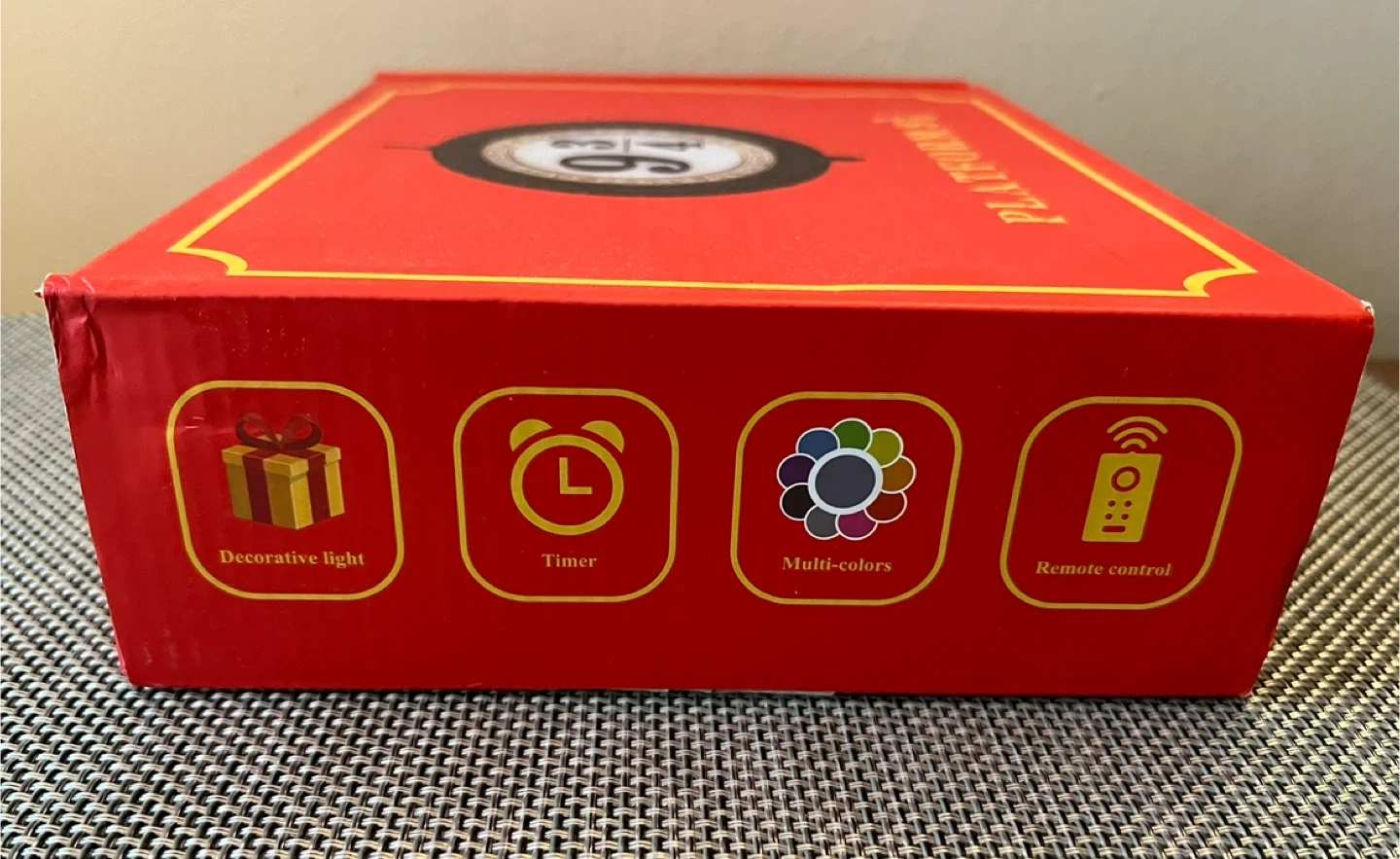 Box includes: light fixture, wall mount, charging cord, remote control.