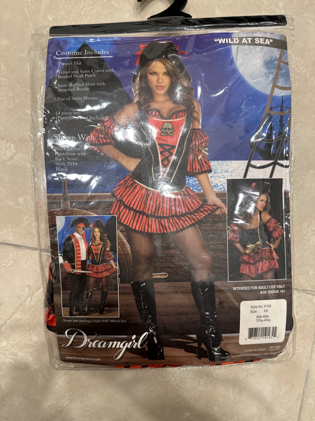 Ahoy there! I'm selling a Dreamgirl Wild at Sea pirate costume. It includes the pirate hat, velvet and satin corset with beaded skull patch, satin ruffled skirt, and a pair of satin sleeves. Size is XS and intended for adult use only (Age 14+).