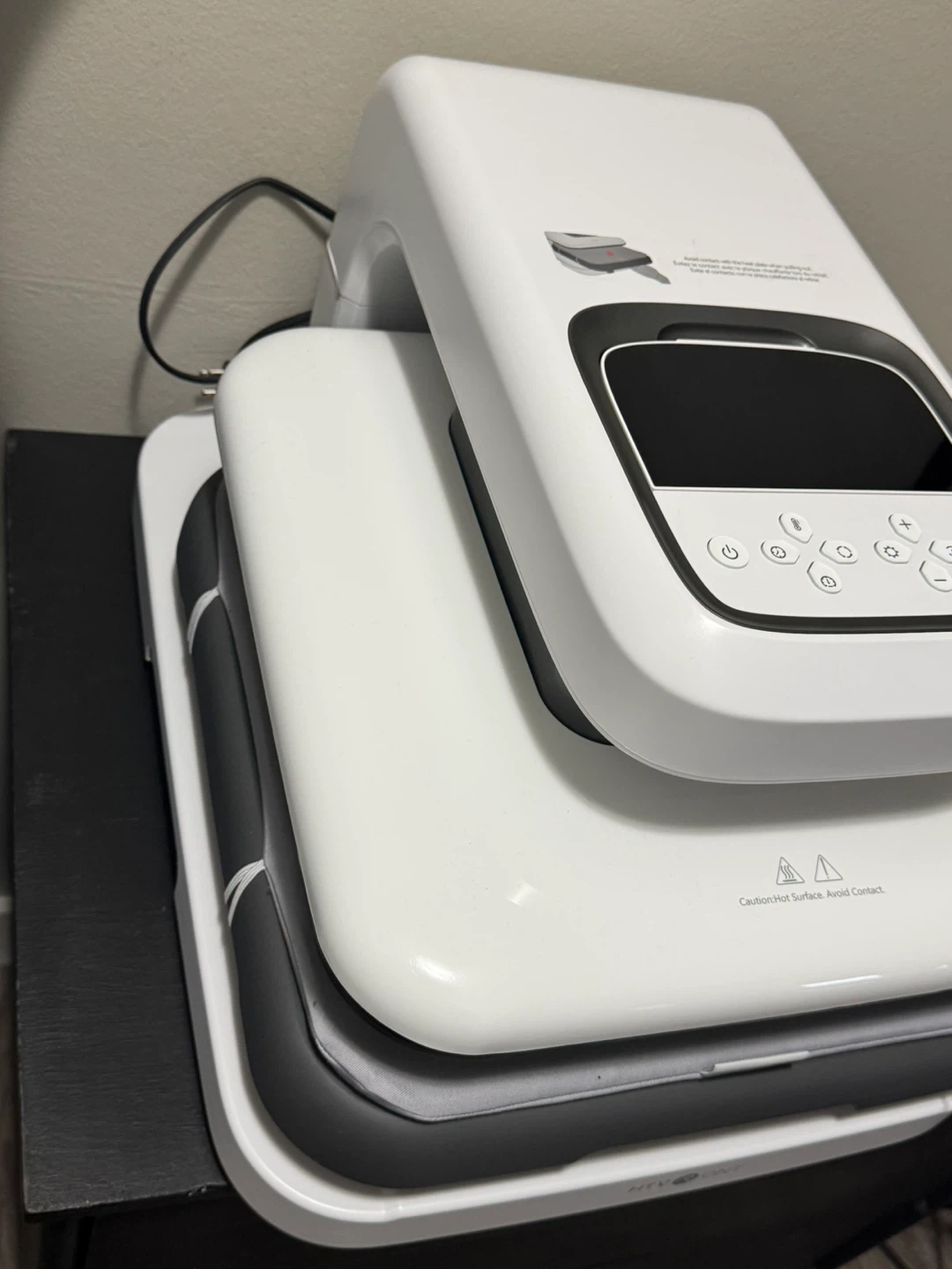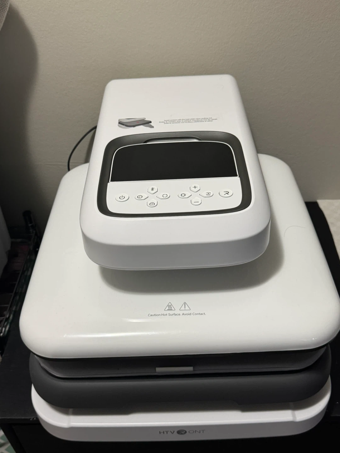 This is a white HTVRONT heat press machine. It has a digital display and control buttons for temperature and time. The machine includes multiple heat plates for various applications. It's suitable for T-shirts, mugs, and other crafts.