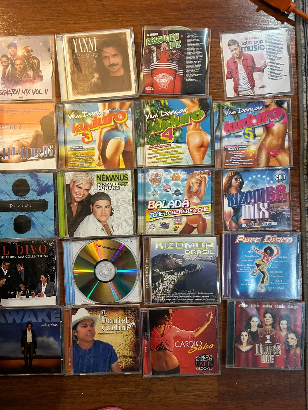 A collection of music CDs featuring various artists and genres. Includes Reggaeton, Kuduro, Kizomba, Latin Pop, and more. Perfect for expanding your music library!