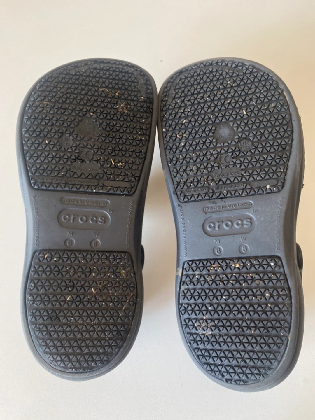 Black Crocs slip-on shoes. These are a size 8. They're made in Vietnam. Excellent non-slip soles for work environments.