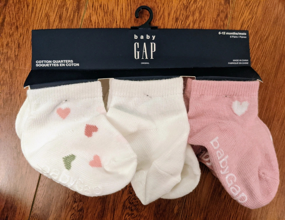Baby Gap cotton quarter socks in a pack of three. Includes white socks with heart pattern and a pink sock. These are for babies aged 6-12 months.