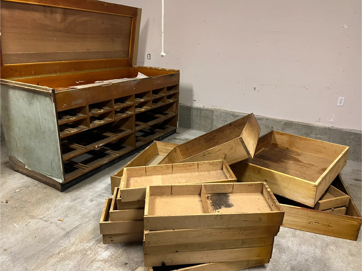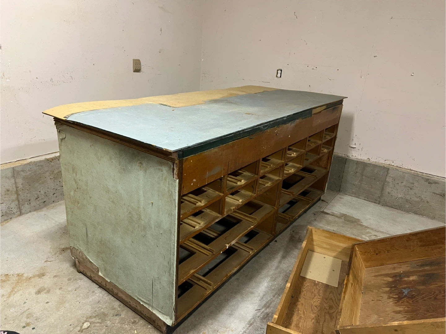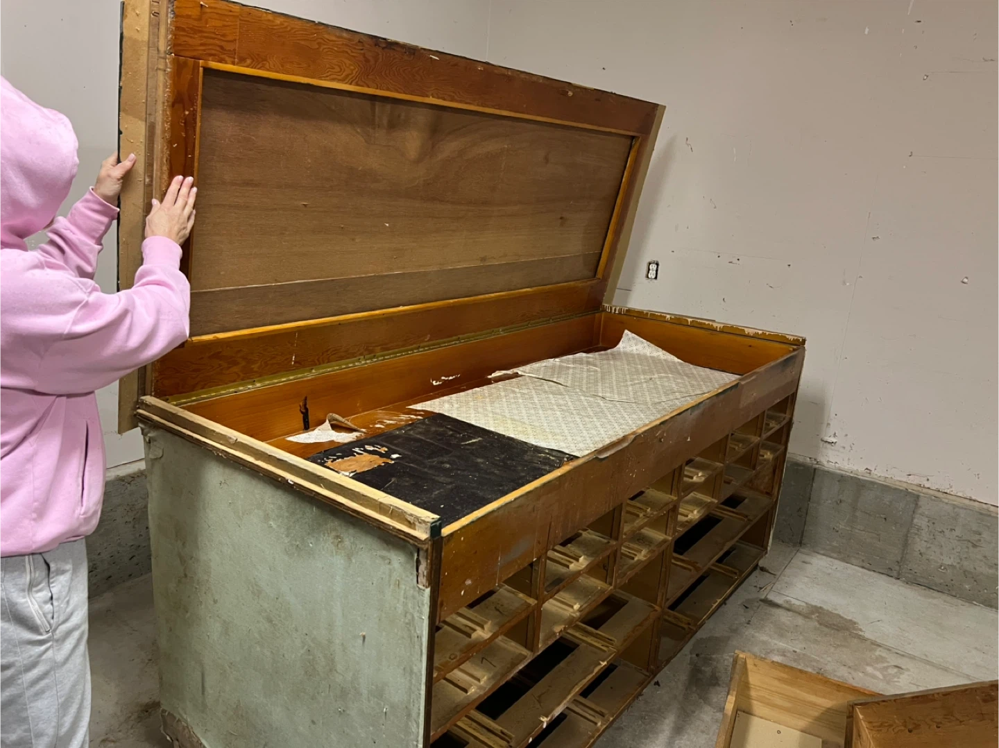 This is a vintage wooden countertop display cabinet. It features multiple small compartments and a lift-top lid. Some drawers are included separately. It's a unique piece for storage or display.