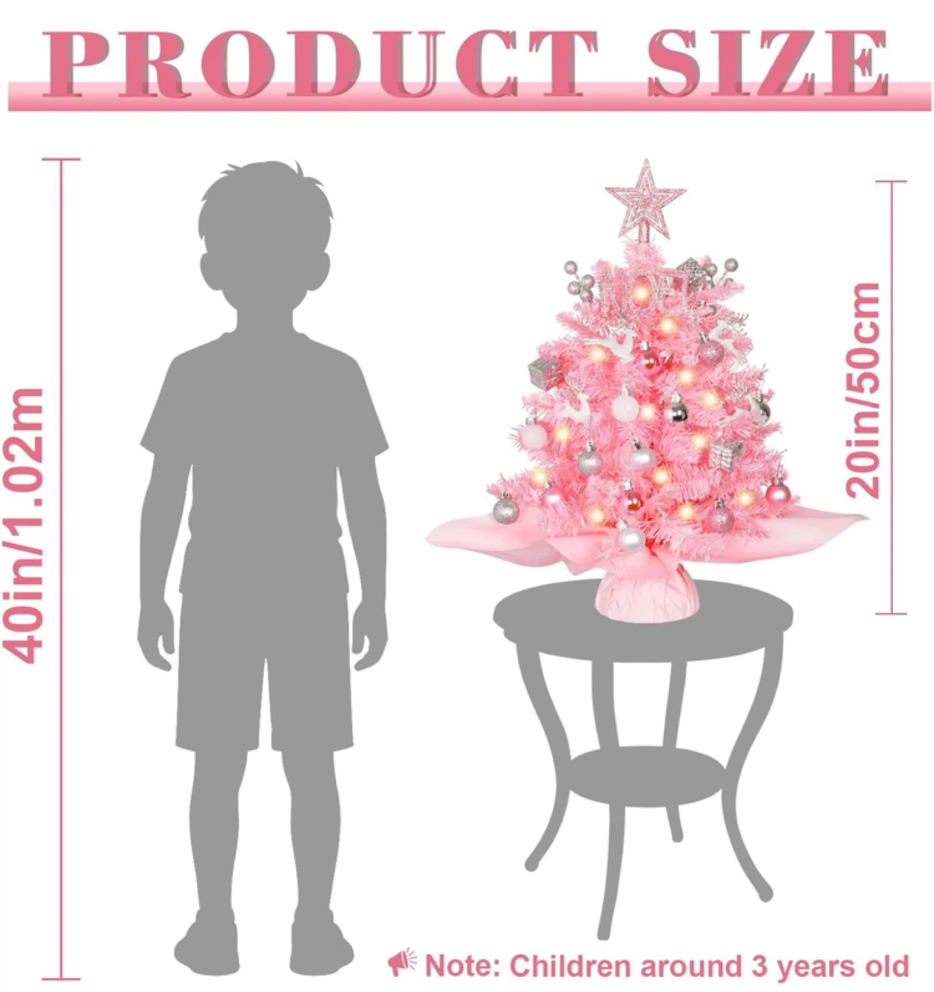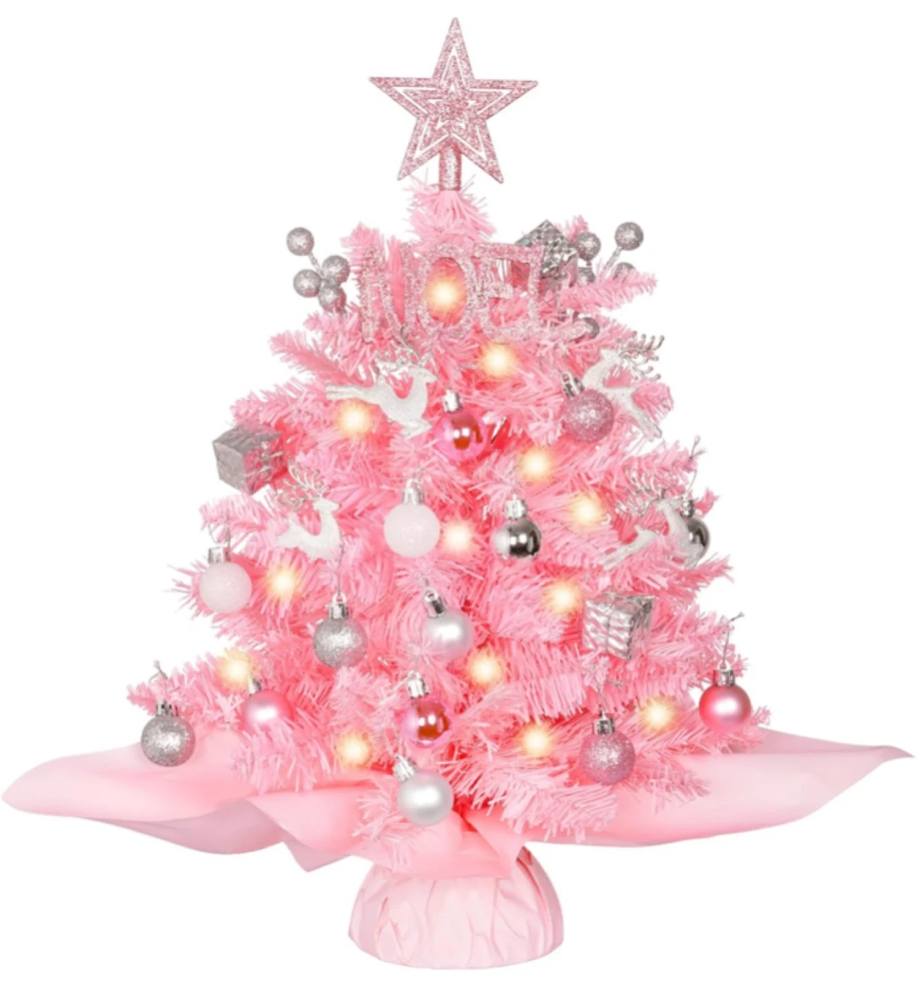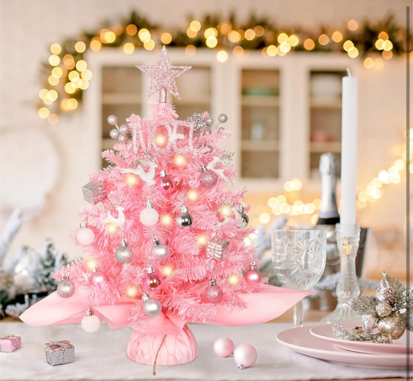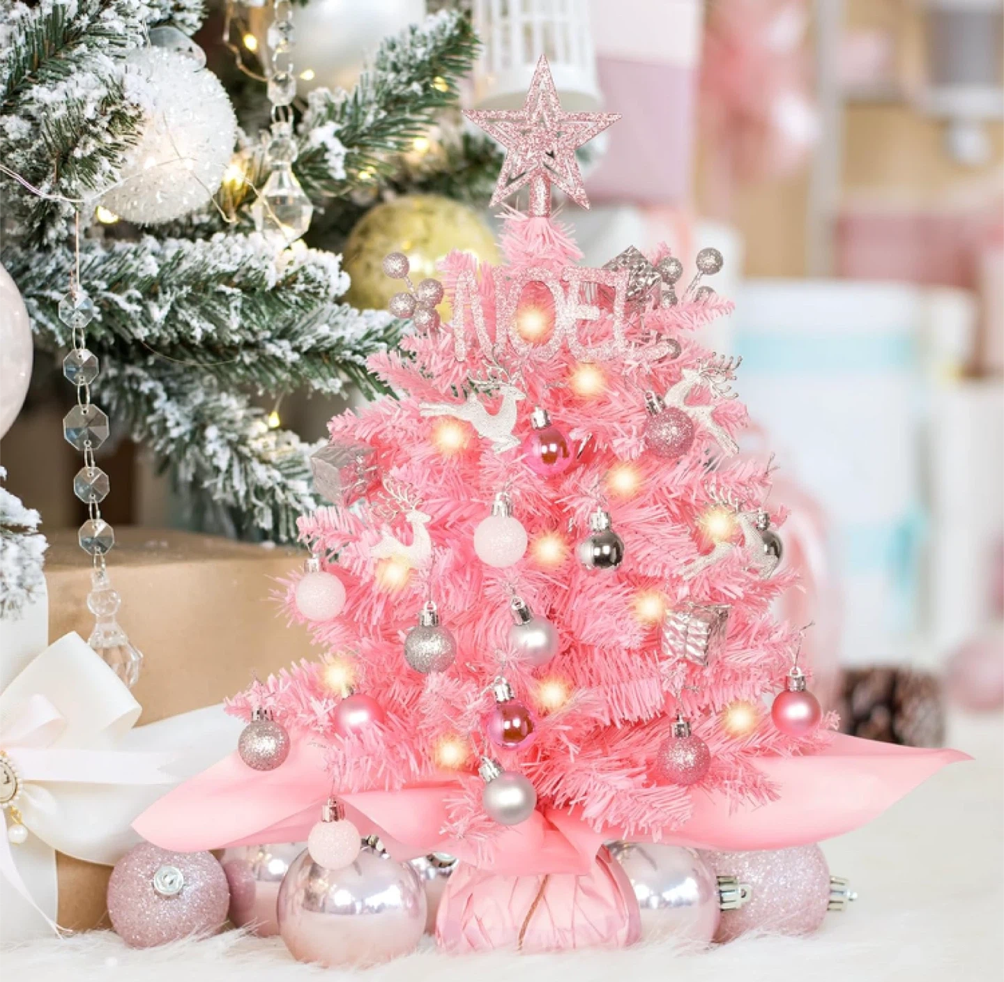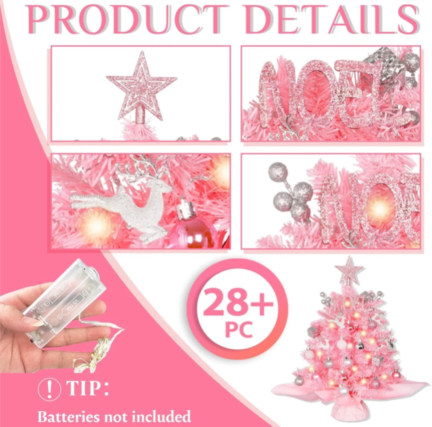 20" Mini Pink Christmas Tree, Artificial Small Table Top Warm Lights, Star Treetop and Ornaments, Tabletop Christmas Tree for DIY Pink Christmas Decoration Gifts