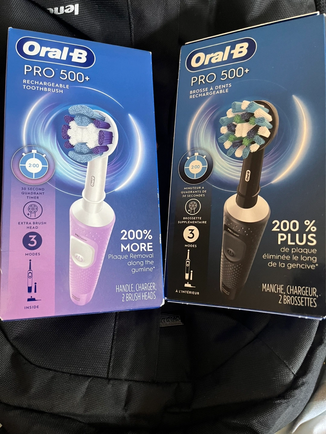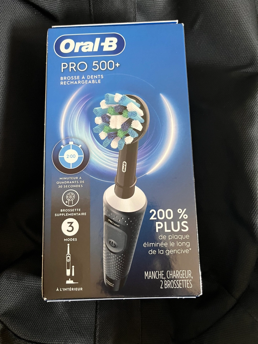 I have an Oral-B PRO 500+ rechargeable toothbrush available. It comes with the handle, charger, and two brush heads, all inside the original box. It also features a 2-minute timer with 30-second quadrants to help you brush effectively. Get ready for a cleaner, healthier smile!