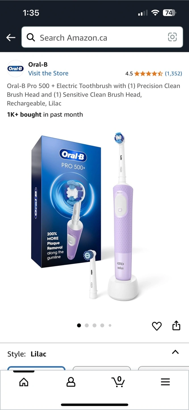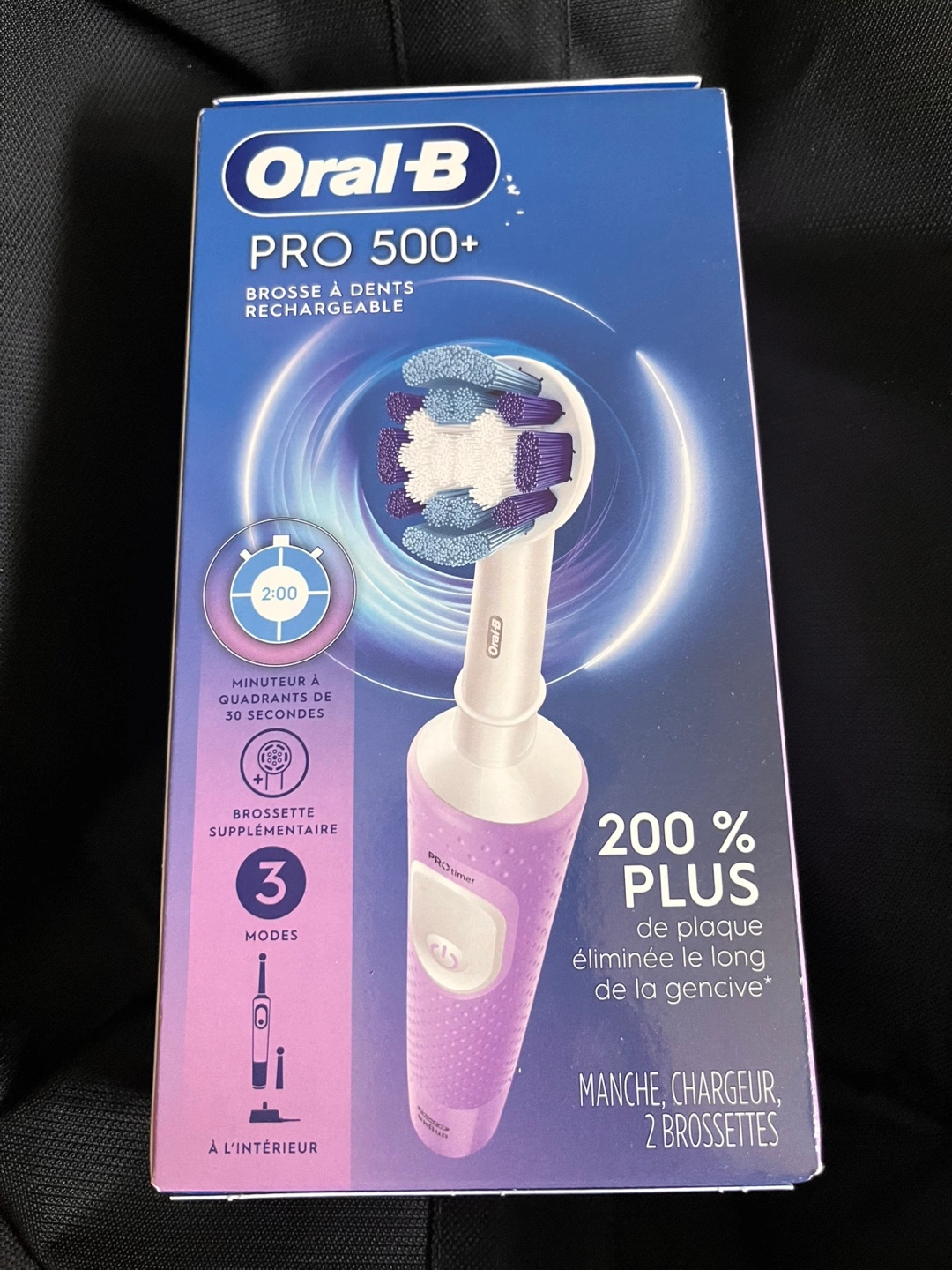 I have an Oral-B PRO 500+ rechargeable toothbrush available. It comes with the handle, charger, and two brush heads, all inside the original box. It also features a 2-minute timer with 30-second quadrants to help you brush effectively. Get ready for a cleaner, healthier smile!