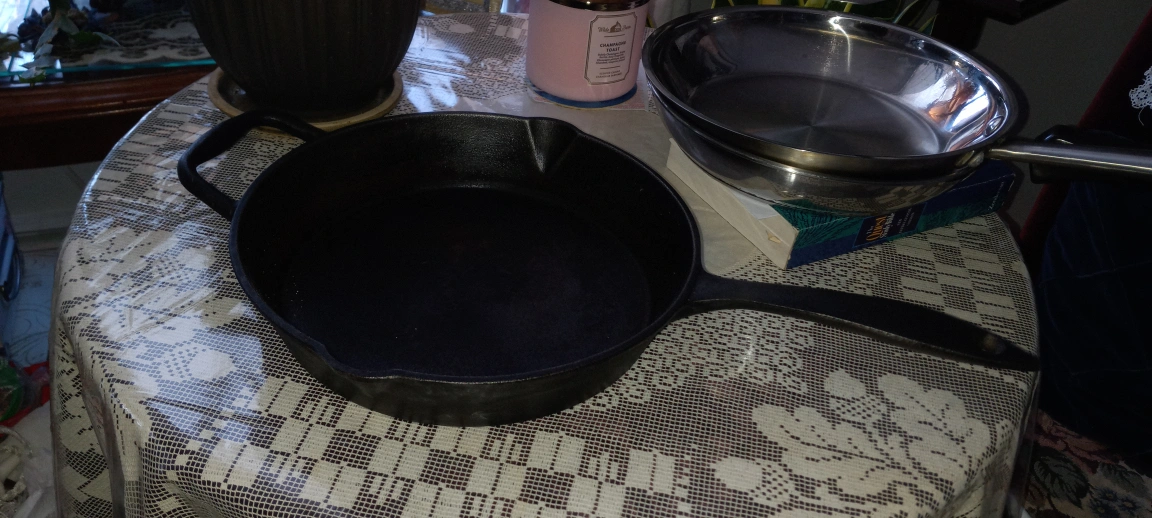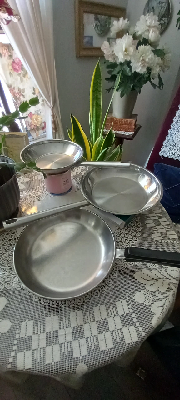 This set includes three stainless steel frying pans and an iron 10 inch w a handle. They're made with durable stainless steel construction. Suitable for everyday cooking needs!