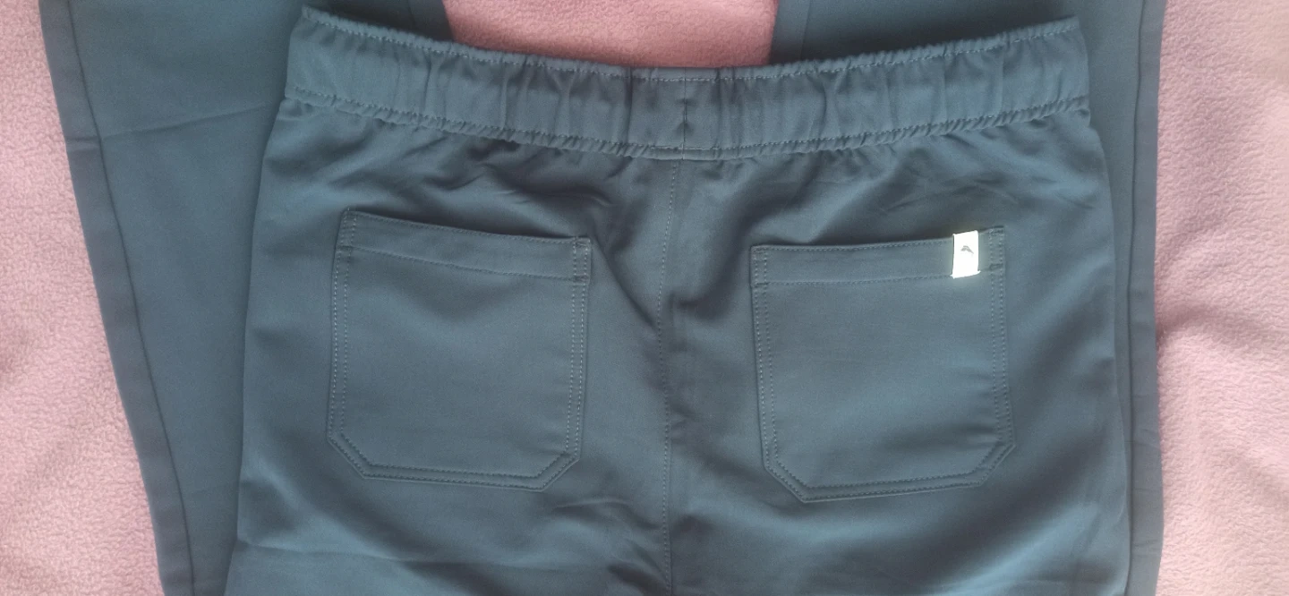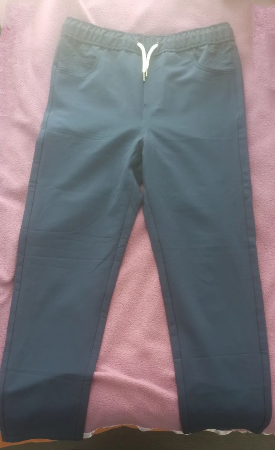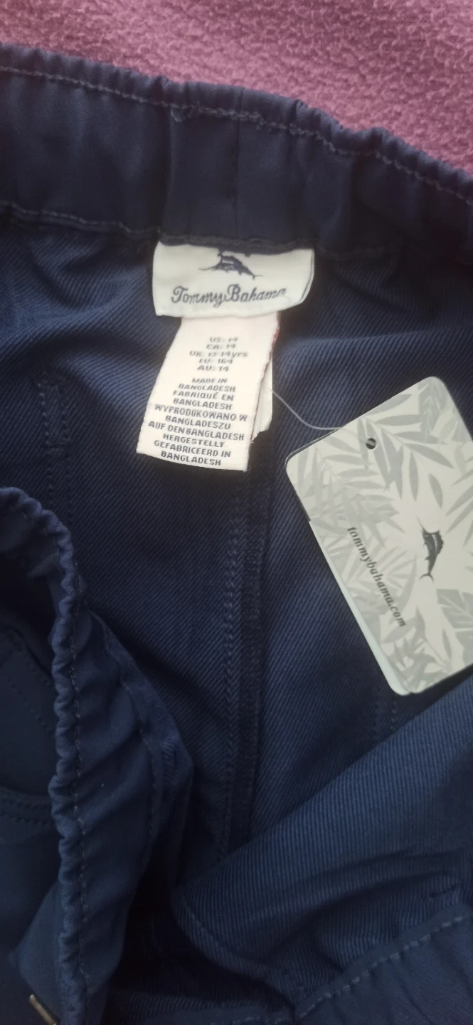 New Tommy Bahama navy blue pants for boys. These are a size 14 with an elastic waistband and drawstring. They're made with a blend of polyester and spandex for comfort.