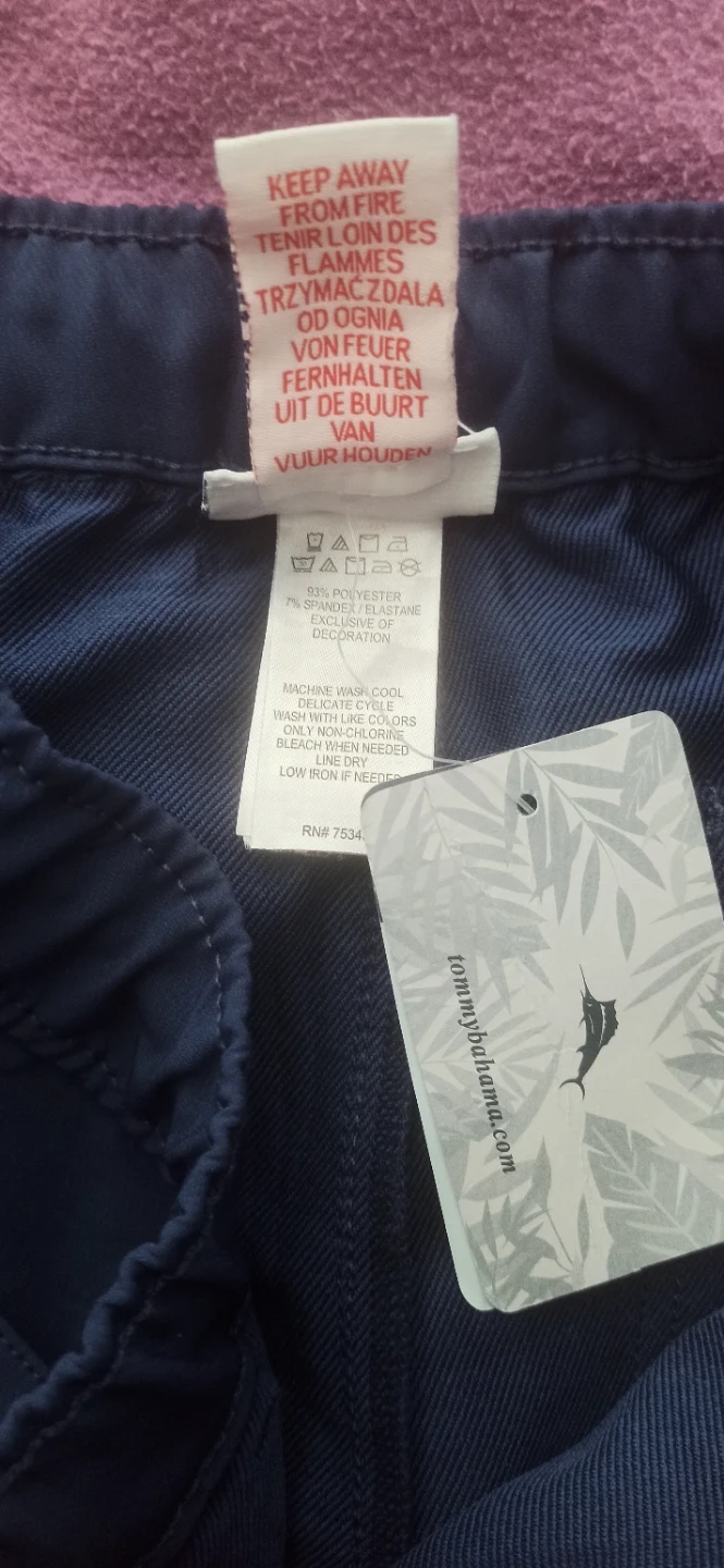 New Tommy Bahama navy blue pants for boys. These are a size 14 with an elastic waistband and drawstring. They're made with a blend of polyester and spandex for comfort.