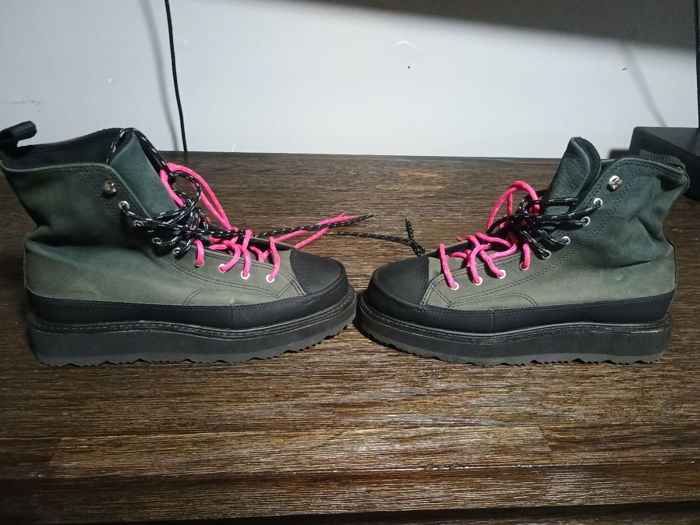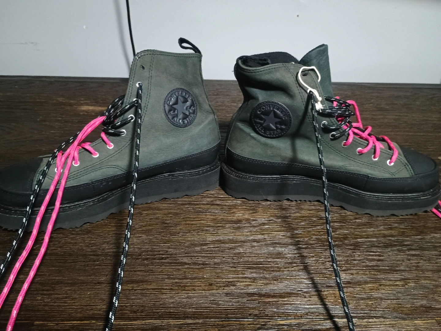 Selling a pair of Converse Chuck Taylor All Star Lugged 2.0 women's boots in size 8. The boots are a stylish gray color with black accents and unique pink and black laces. These have a lugged sole for added traction and a modern twist on the classic Chuck Taylor design