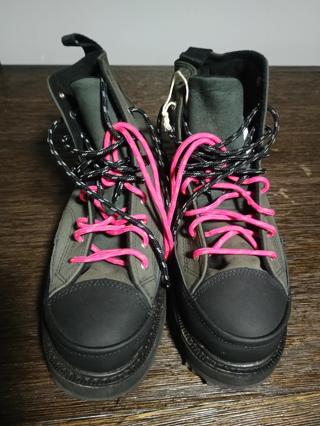 Selling a pair of Converse Chuck Taylor All Star Lugged 2.0 women's boots in size 8. The boots are a stylish gray color with black accents and unique pink and black laces. These have a lugged sole for added traction and a modern twist on the classic Chuck Taylor design