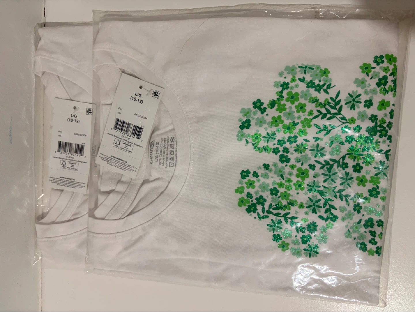 Two white George t-shirts for girls. Both are size L (10-12) and feature a sparkly green shamrock design. 100% cotton fabric.
