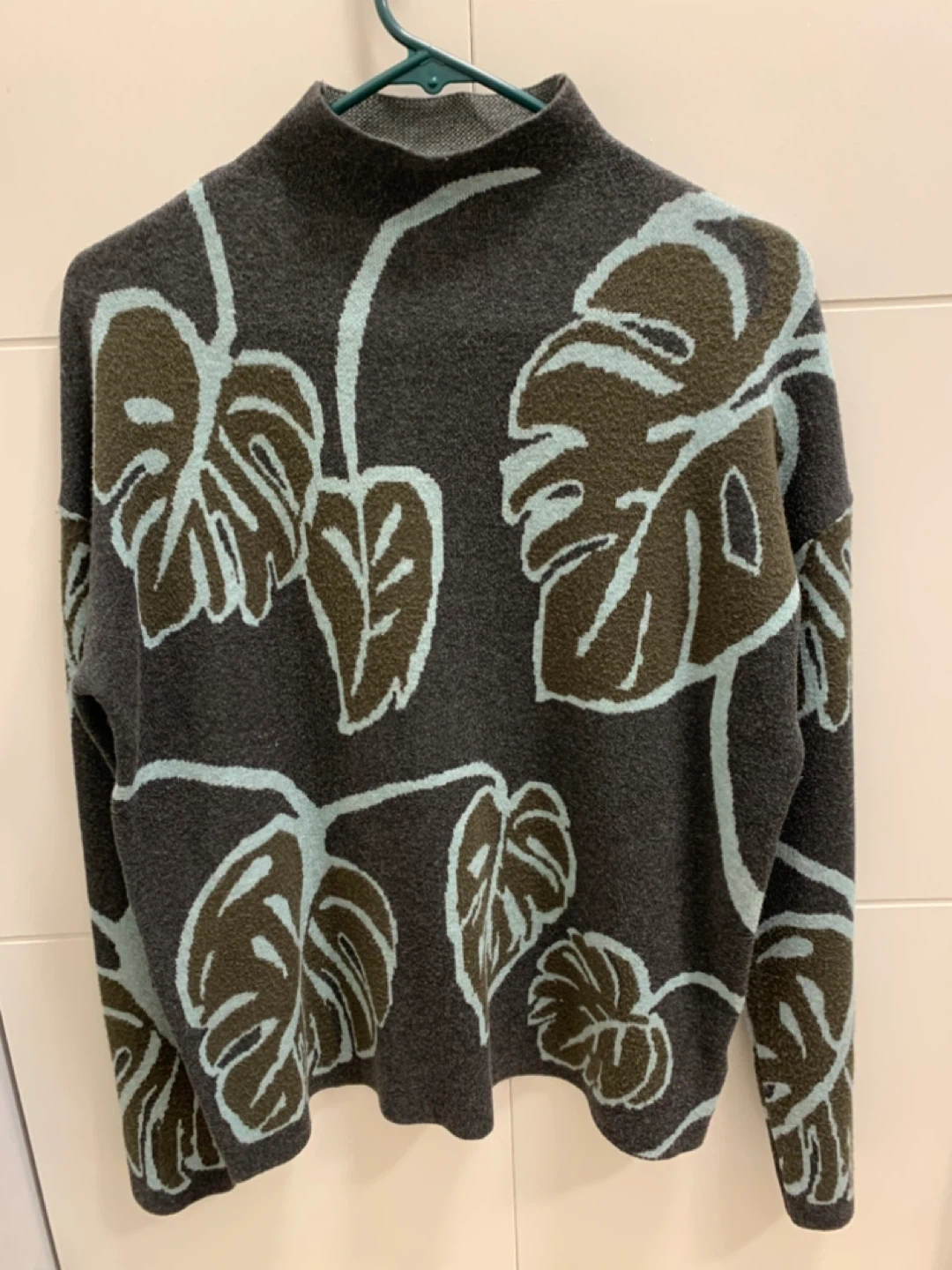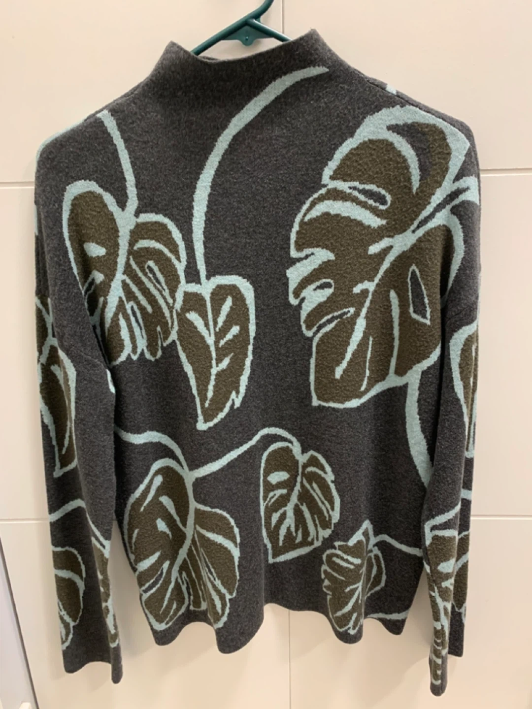 This Rachel Zoe sweater features a stylish mock neck and a bold botanical print. It's made for a comfortable fit. A great piece for adding some flair to your cooler weather wardrobe!