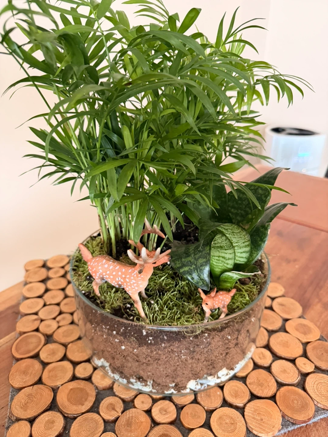 A lovely indoor plant arrangement featuring a variety of greenery and whimsical deer figurines. Perfect for adding a touch of nature to any room!