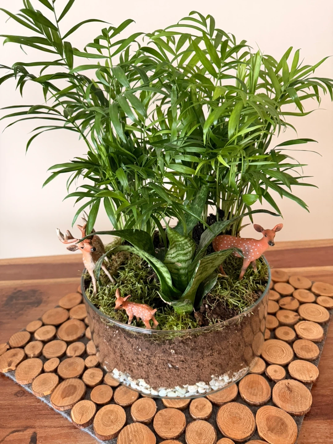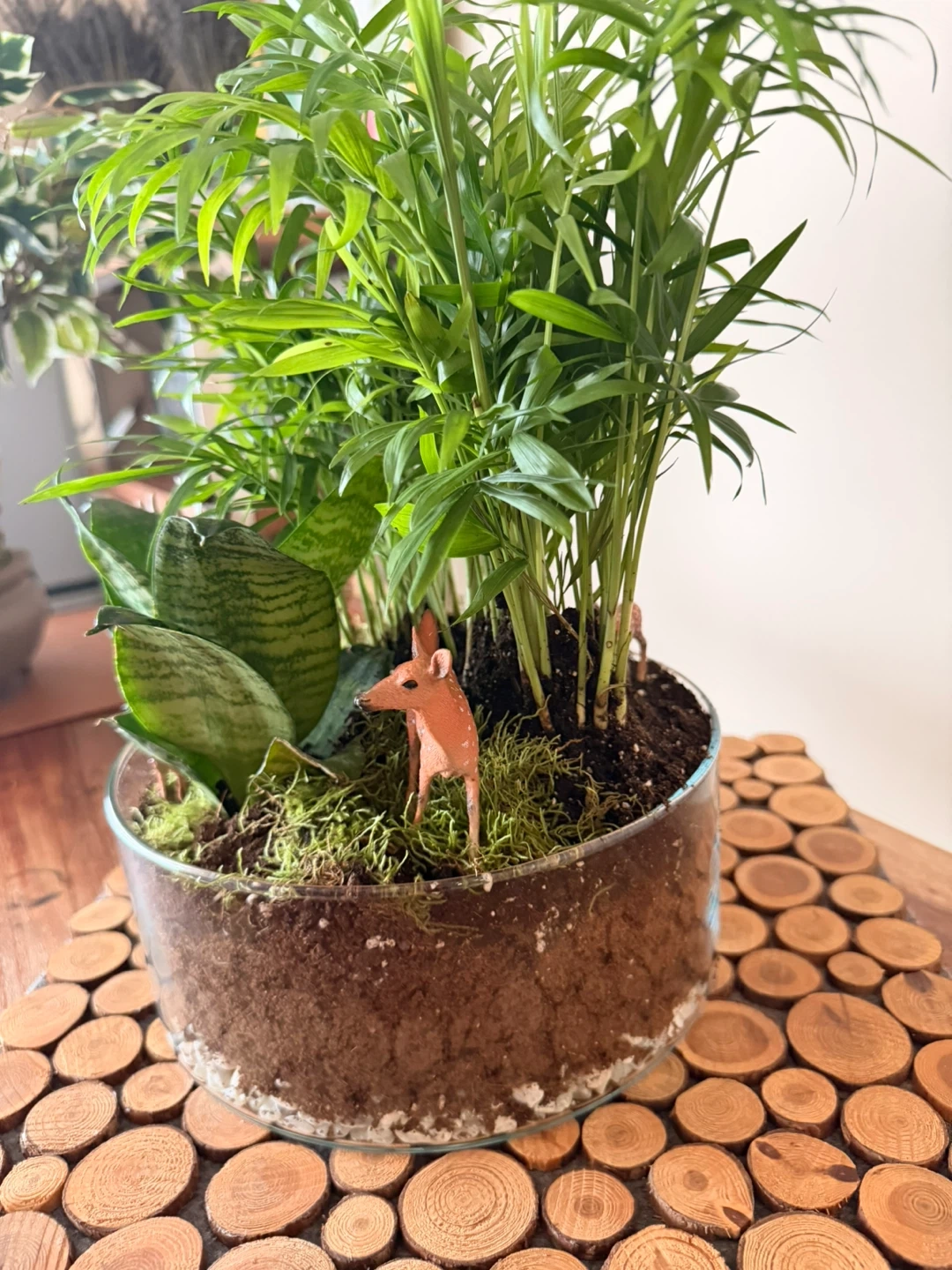 A lovely indoor plant arrangement featuring a variety of greenery and whimsical deer figurines. Perfect for adding a touch of nature to any room!