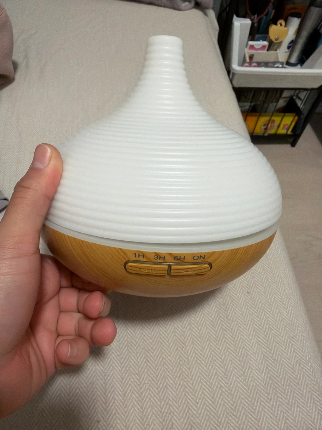This is a white aroma diffuser with a wood grain base. It has timer settings for 1, 3, and 6 hours, as well as an 'ON' setting. The buttons are labeled 'LIGHT' and 'MIST'š§”
