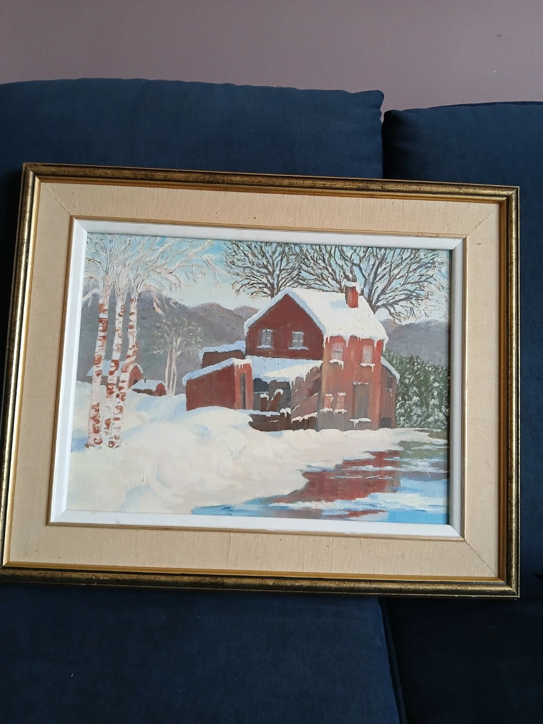 Subject: Rural Winter Landscape; A quintessential piece of Canadian folk art influenced regionalism. Making it a highly vibrant red on white contrasting the traditional subject matter.