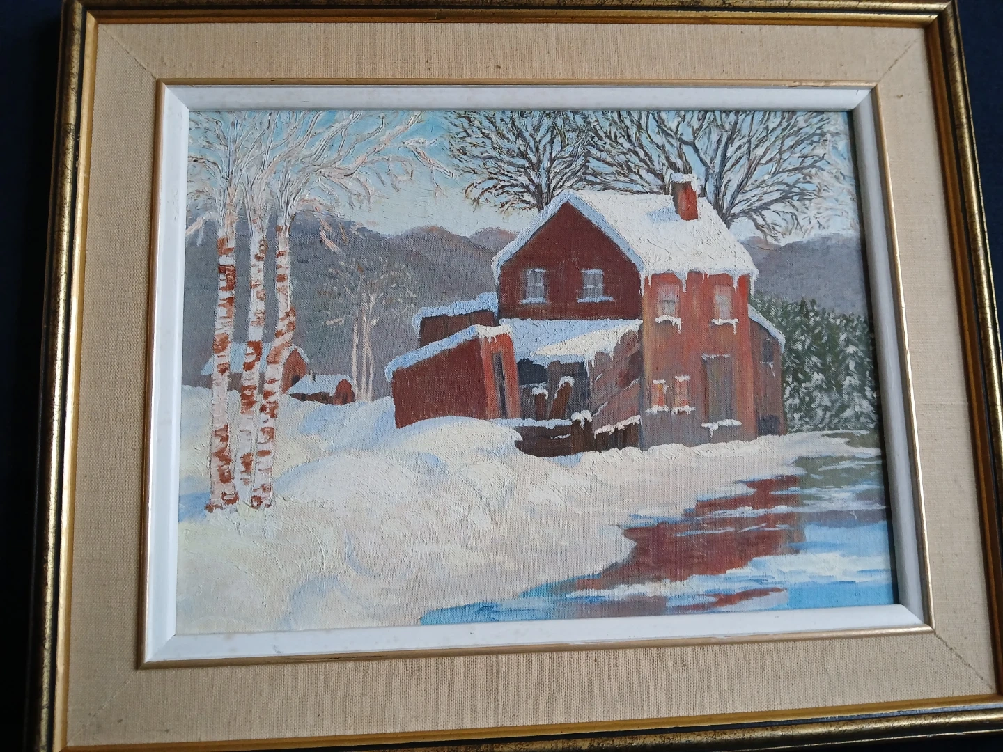 Subject: Rural Winter Landscape; A quintessential piece of Canadian folk art influenced regionalism. Making it a highly vibrant red on white contrasting the traditional subject matter.