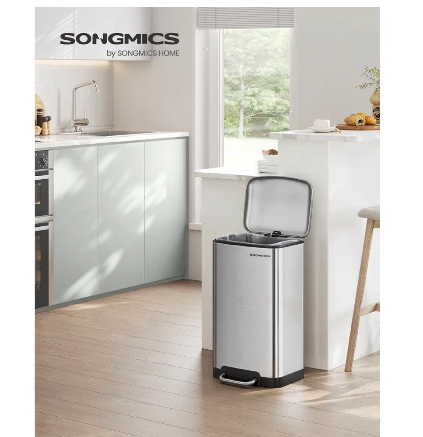 SONGMICS 8-gallon (30L) stainless steel trash can. Features a compact profile that fits most spaces and a soft-close lid. Includes a removable inner bin for easy cleaning. Silver colour.