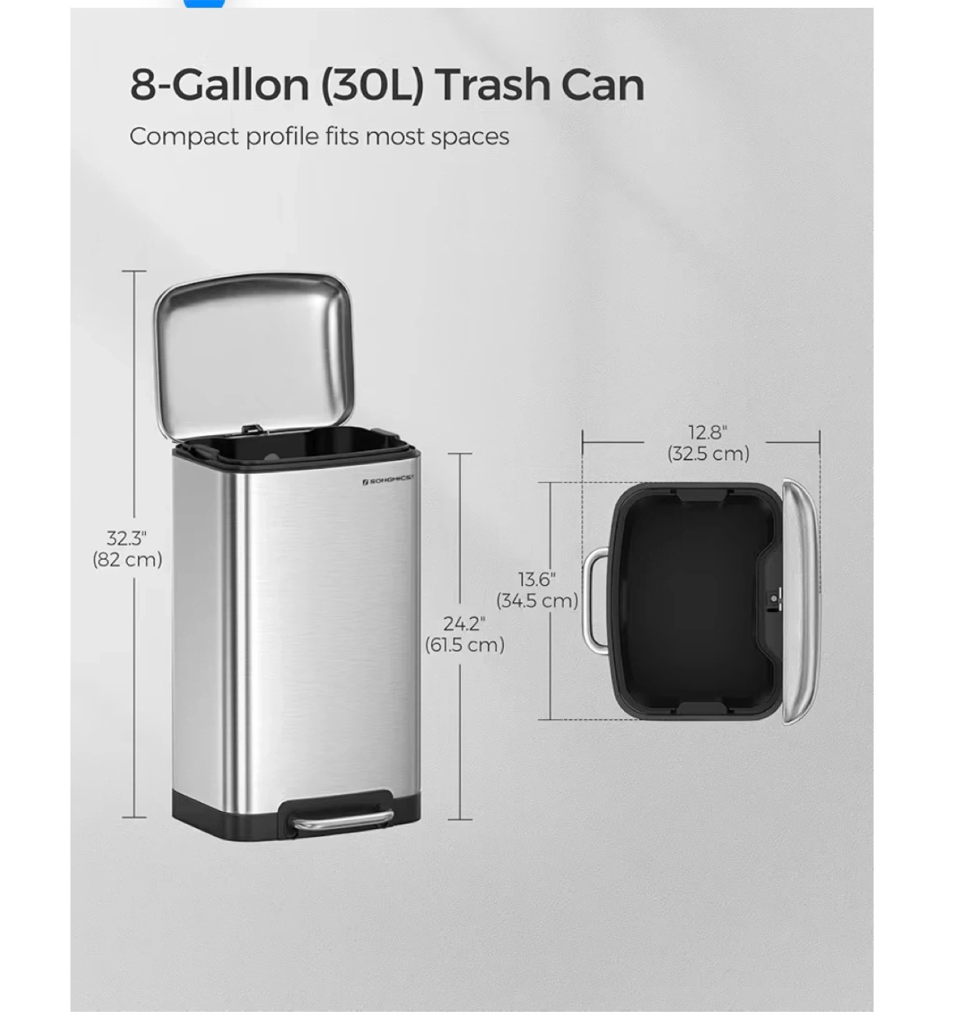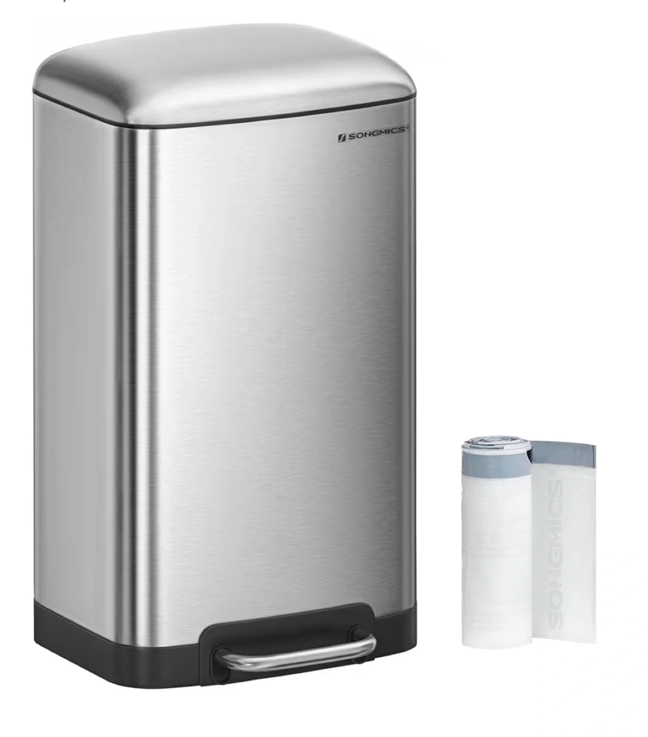 SONGMICS 8-gallon (30L) stainless steel trash can. Features a compact profile that fits most spaces and a soft-close lid. Includes a removable inner bin for easy cleaning. Silver colour.