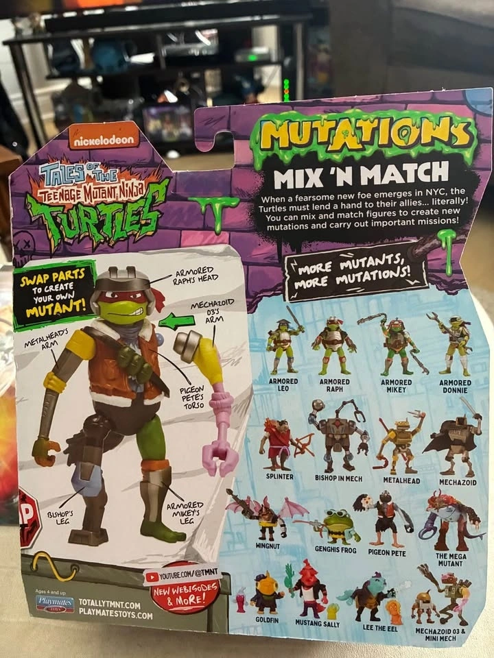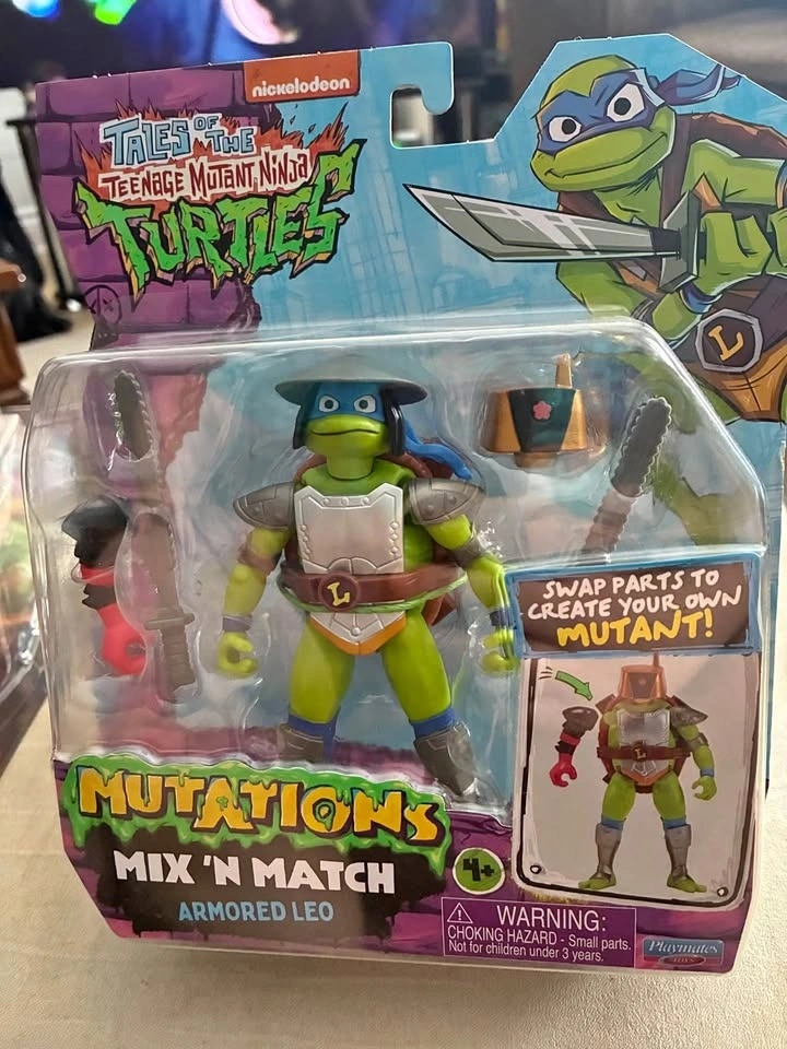 This is a Playmates Tales of the Teenage Mutant Ninja Turtles Mutations Mix 'N Match Armored Leo action figure. The 5-inch figure allows users to swap parts to create their own mutant. It is based on the Tales of a Teenage Mutant Ninja Turtle series. The figure is highly detailed with multiple points of articulation for posing. It comes with various accessories, including swords and a hat.