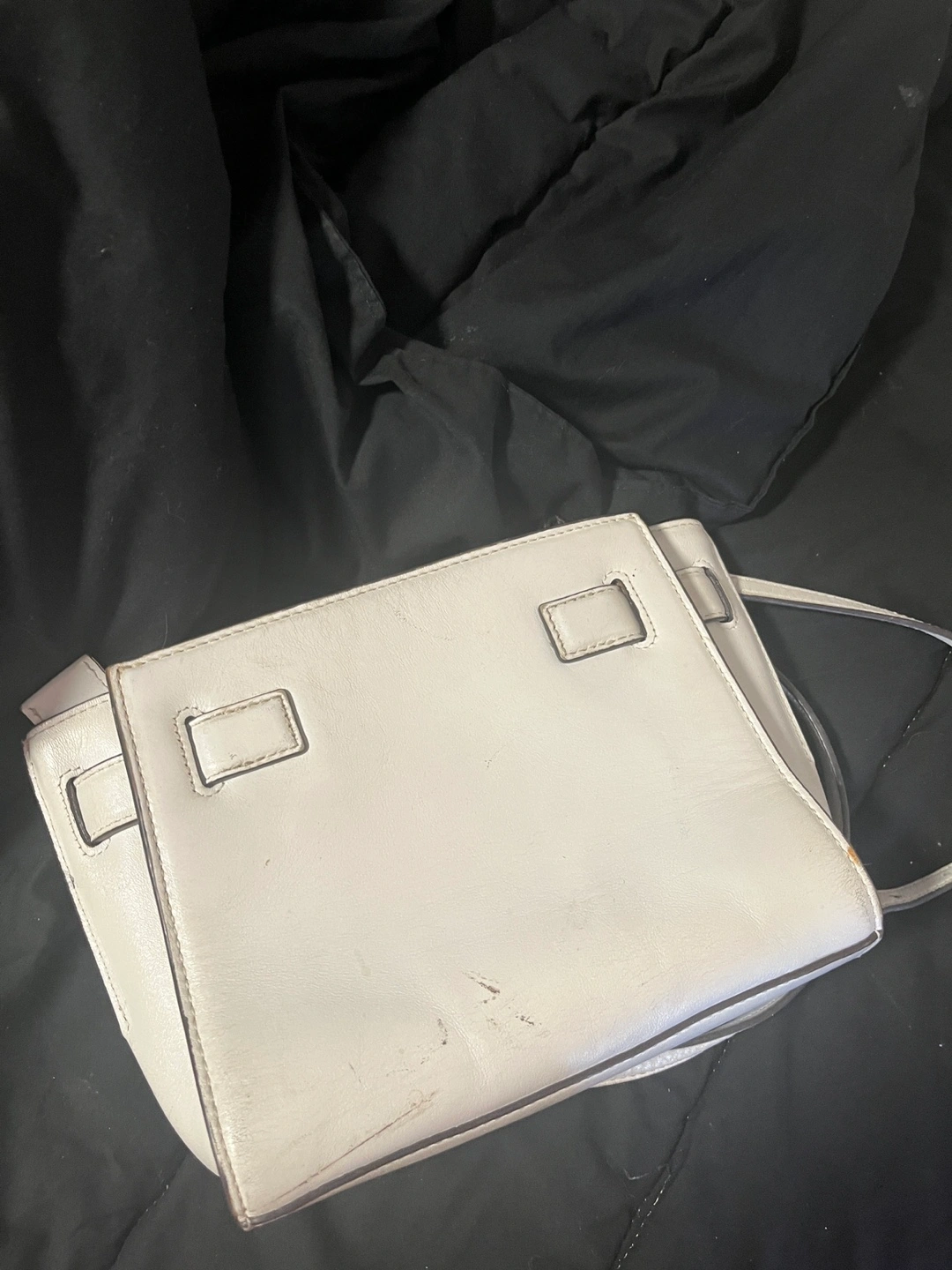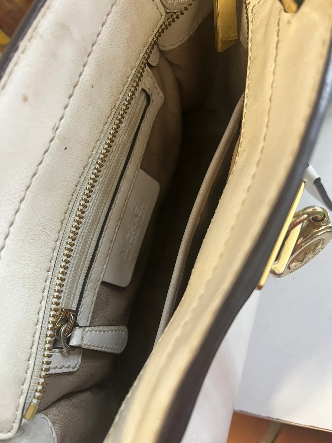 Selling a gently used Michael Kors handbag. It's a stylish white leather, perfect for everyday use. There are some signs of wear, but overall in good condition!