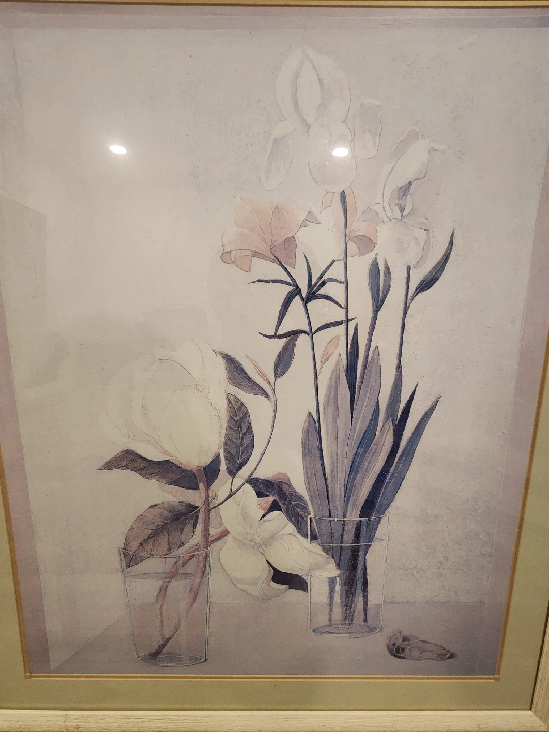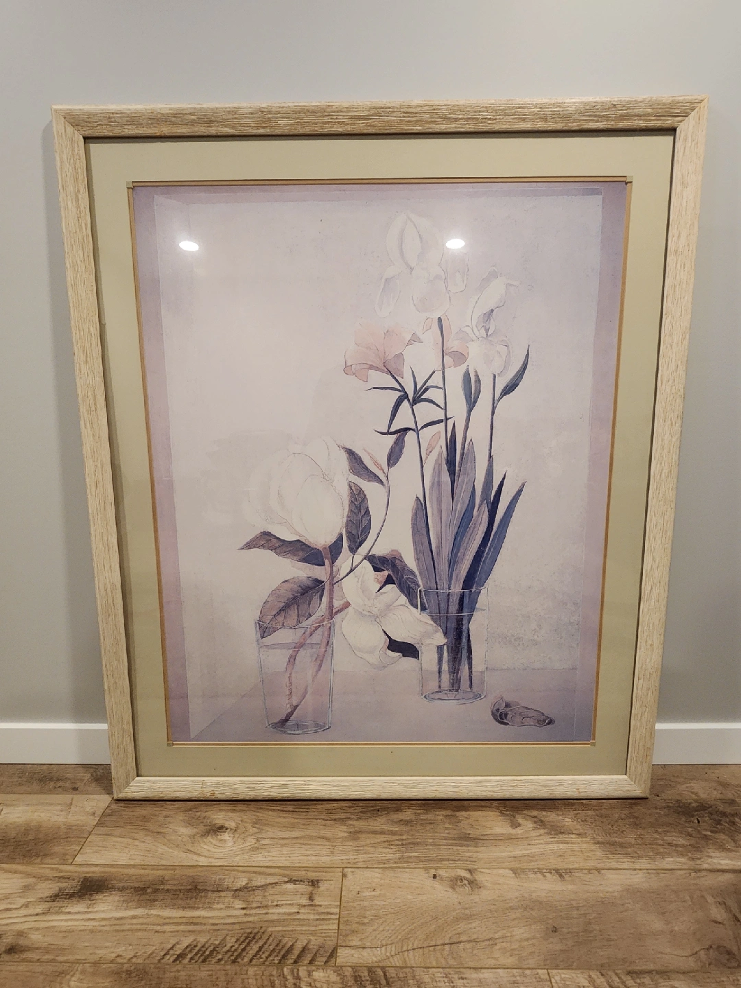 A lovely framed floral print, perfect for adding a touch of elegance to any room! The print features white and pink flowers in clear vases. The frame is a light wood colour. It's in great condition and ready to hang!