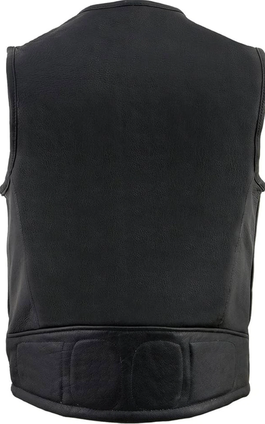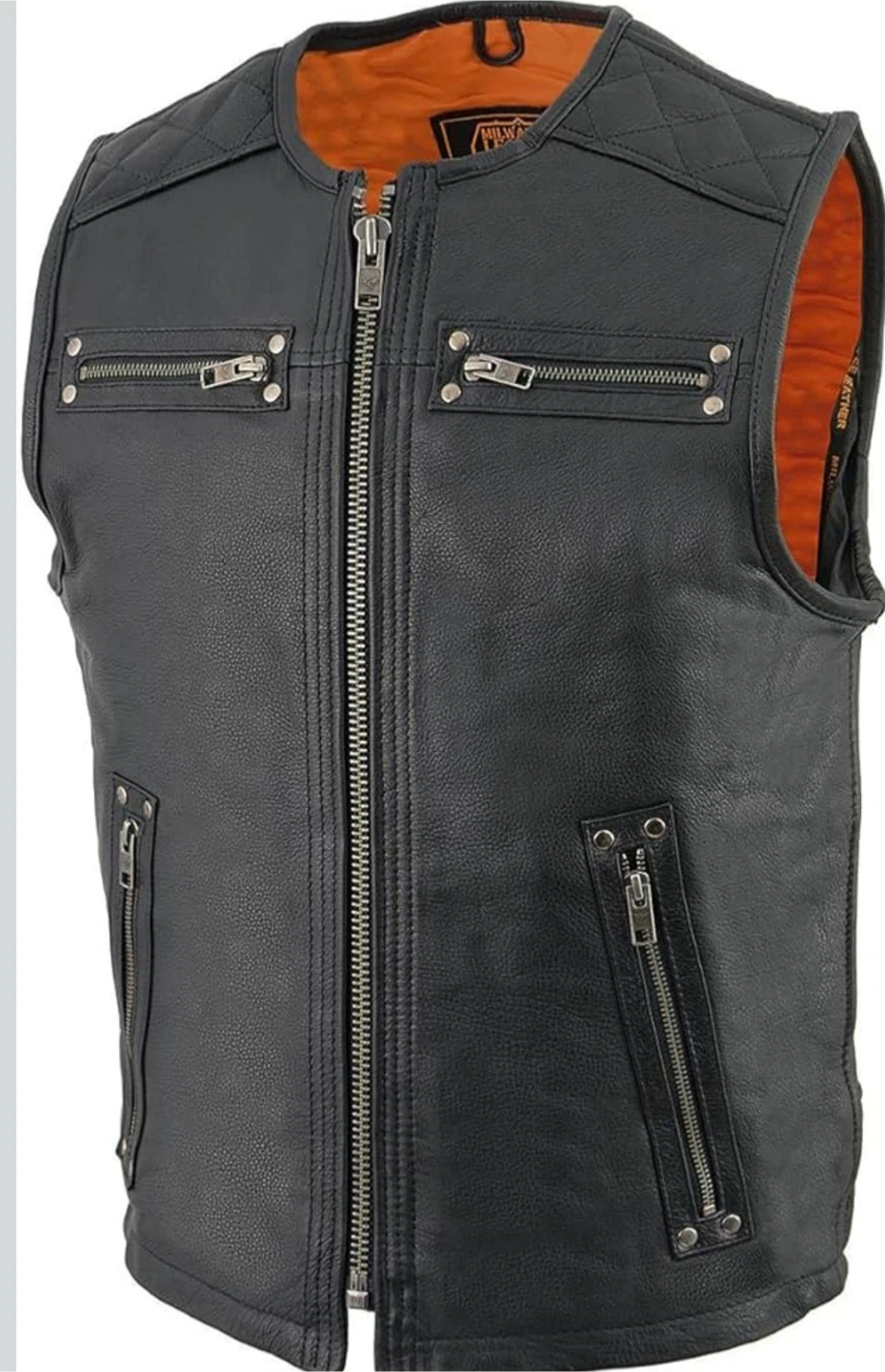 Here's a Milwaukee Leather vest in black. It is made of leather and has a zipper closure. There are several pockets on the front of the vest and inside of vest. Comes with Gun pocket.