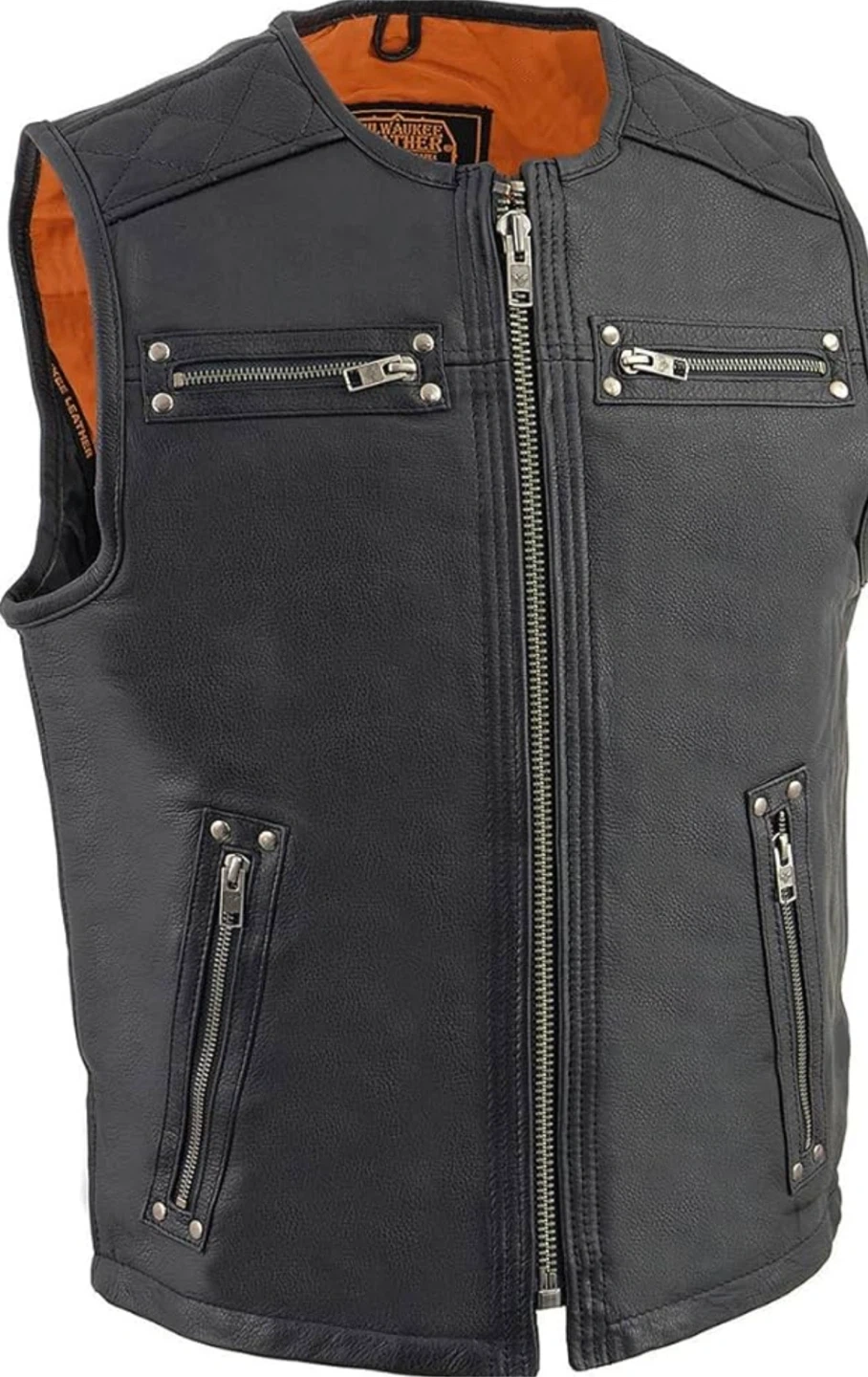 Here's a Milwaukee Leather vest in black. It is made of leather and has a zipper closure. There are several pockets on the front of the vest and inside of vest. Comes with Gun pocket.