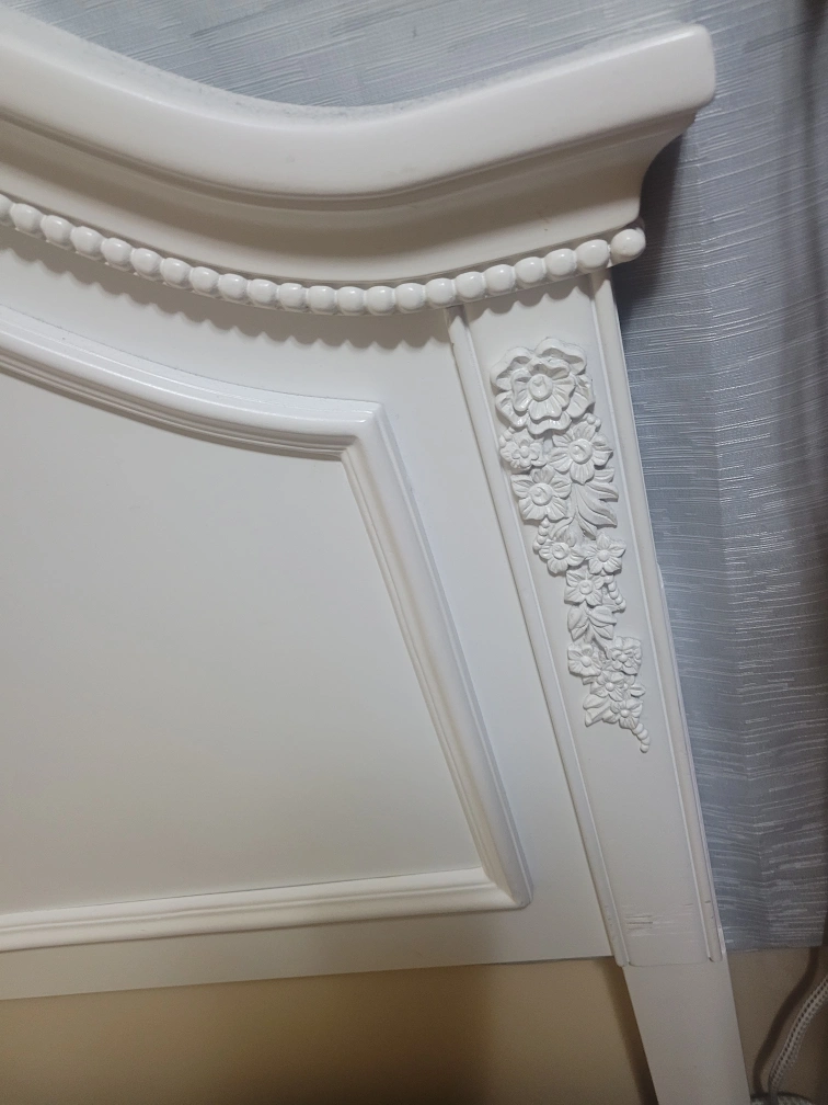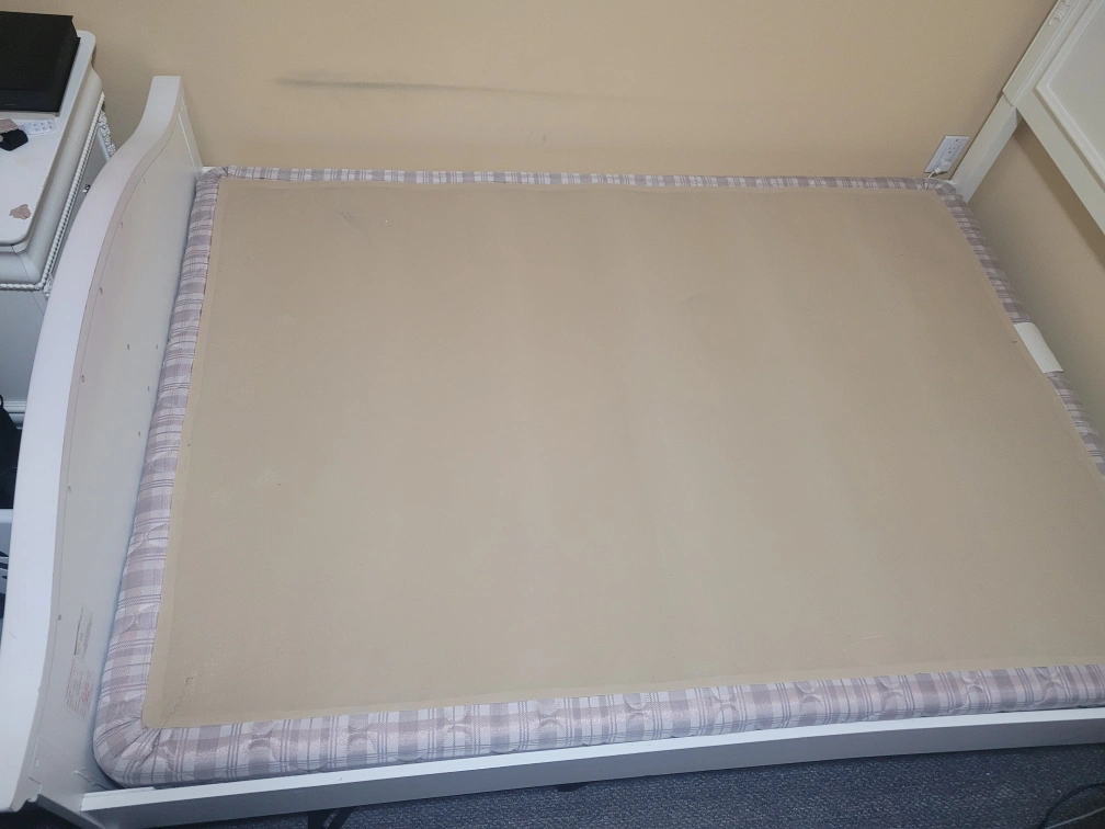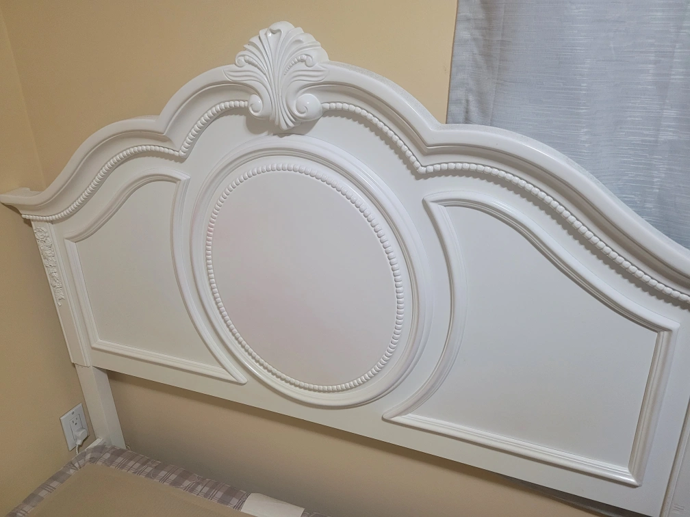 Double bed frame with a headboard. The frame is in good condition, but has some red stains from hair dye.