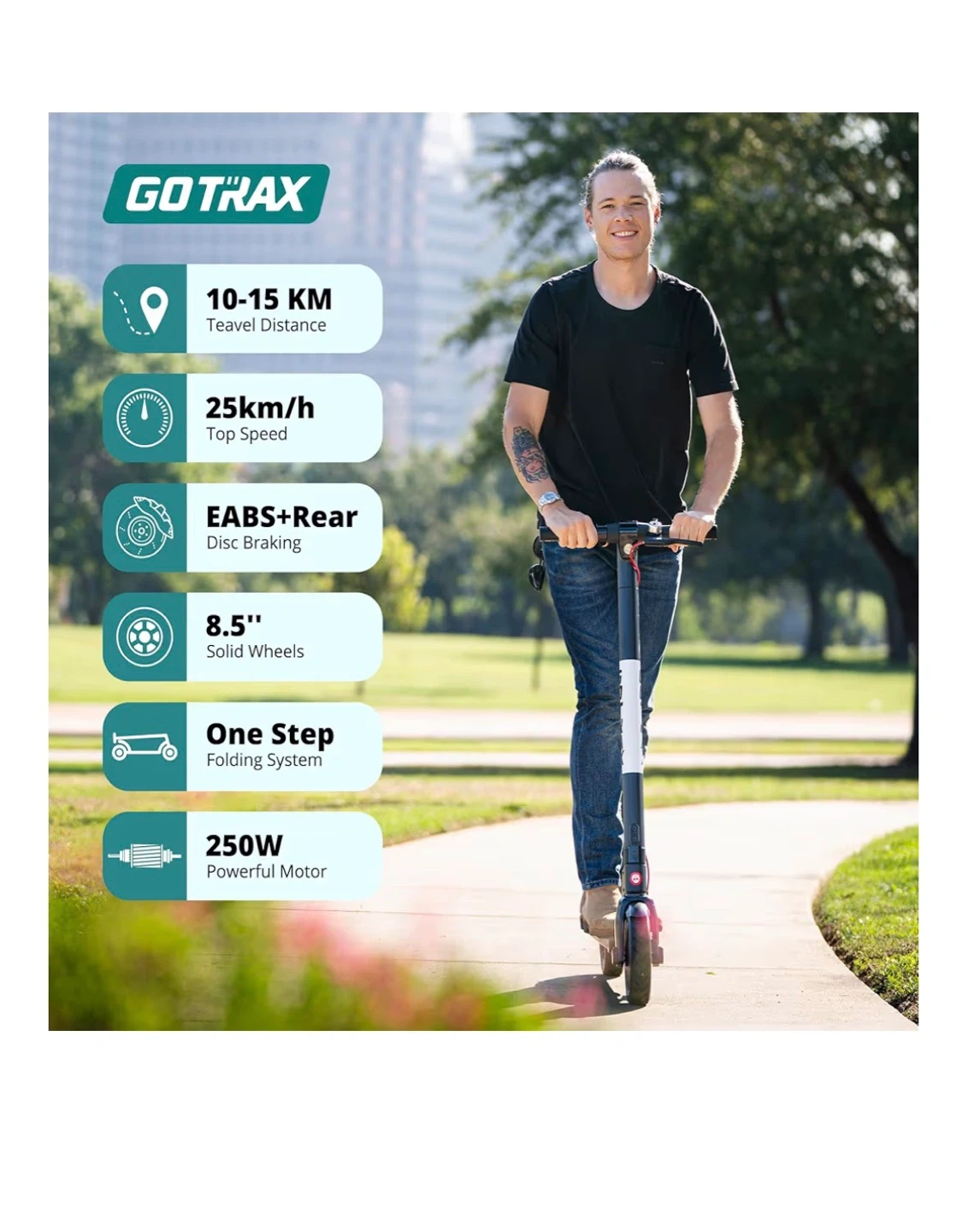 Gotrax electric scooter with a 250W motor and 8.5" solid wheels. It has a top speed of 25 km/h and a travel distance of 10-15 km.