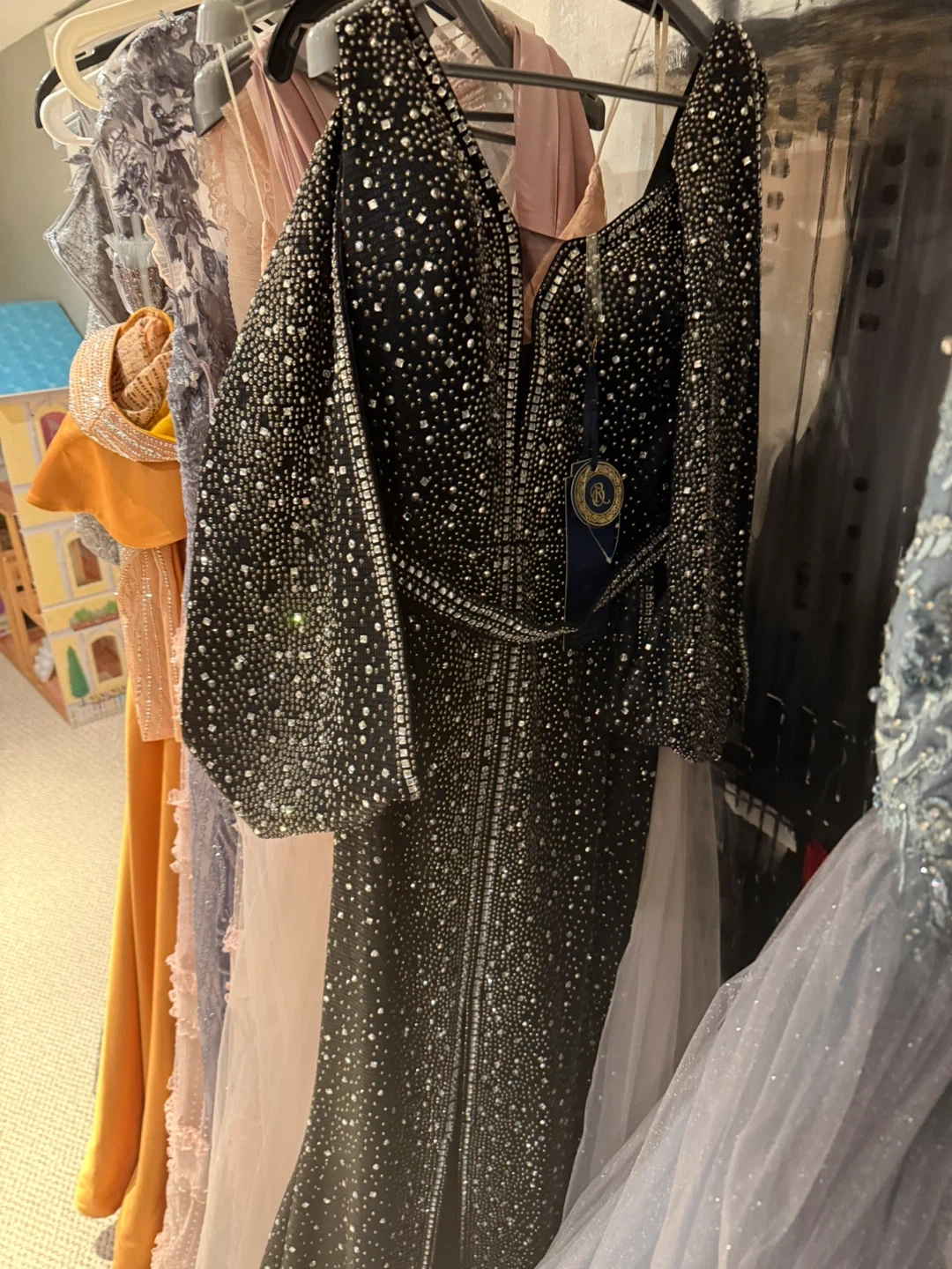 A striking black gown fully adorned with sparkling embellishments. Features a deep V-neckline and long sleeves. This dress is designed to make a statement for special occasions.