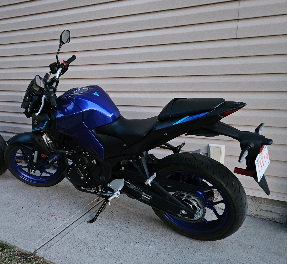 Selling my 2023 Yamaha MT-03 – great bike, lightweight and fun to ride. Has adjustable levers, frame sliders and SC project exhaust.