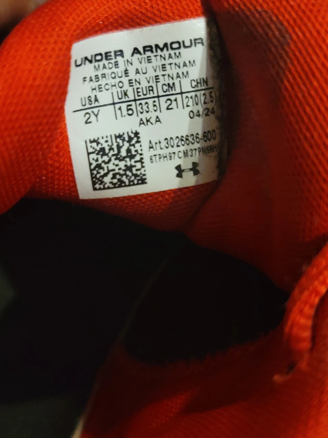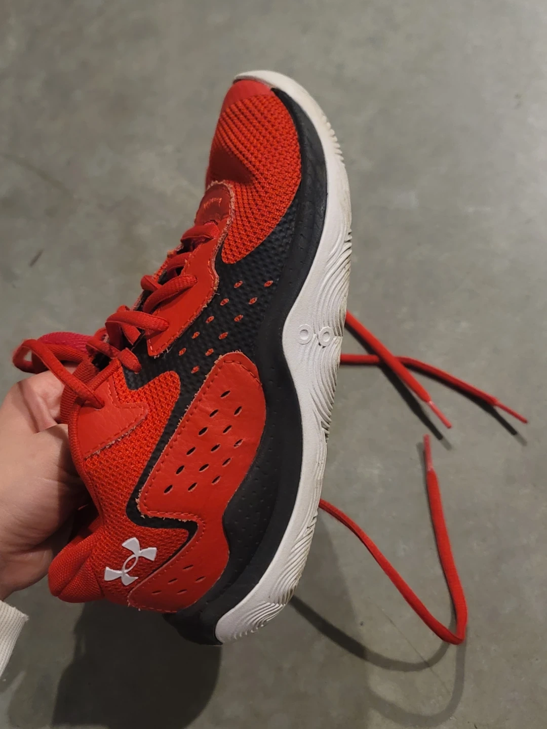 These Under Armour basketball shoes are red with black accents. They're a youth size 2Y, featuring a durable sole for traction. Good for playing sports or casual wear.
