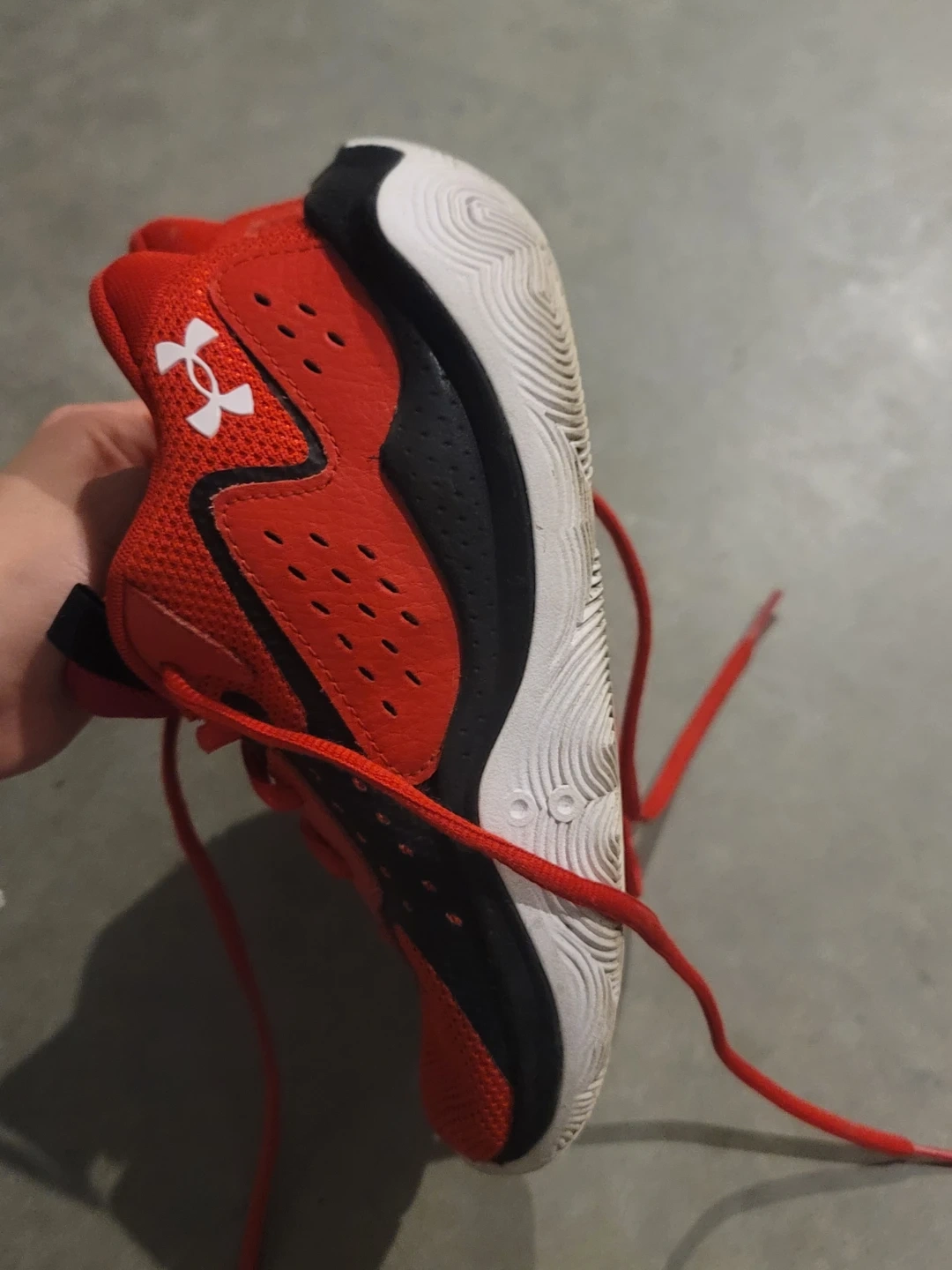 These Under Armour basketball shoes are red with black accents. They're a youth size 2Y, featuring a durable sole for traction. Good for playing sports or casual wear.