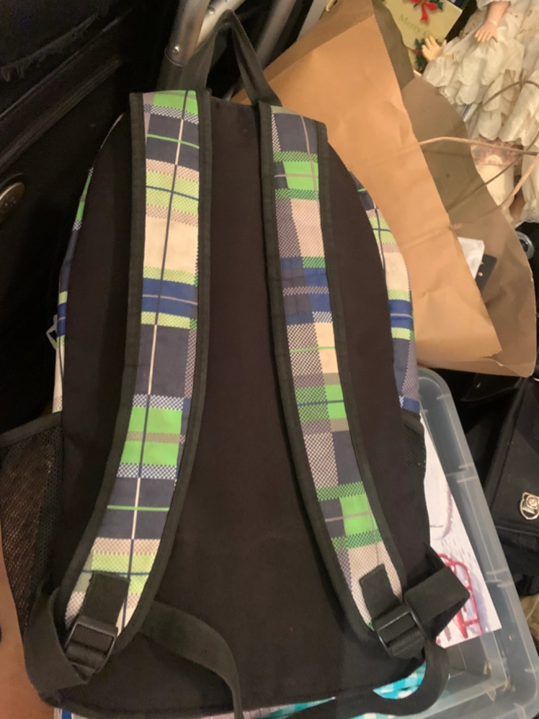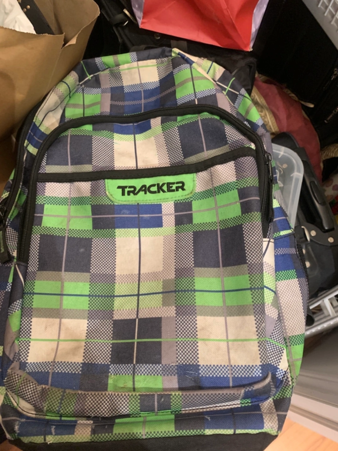 This is a Tracker backpack with a plaid pattern in green, blue, and white. It's in used condition with some signs of wear, but still has lots of life left!