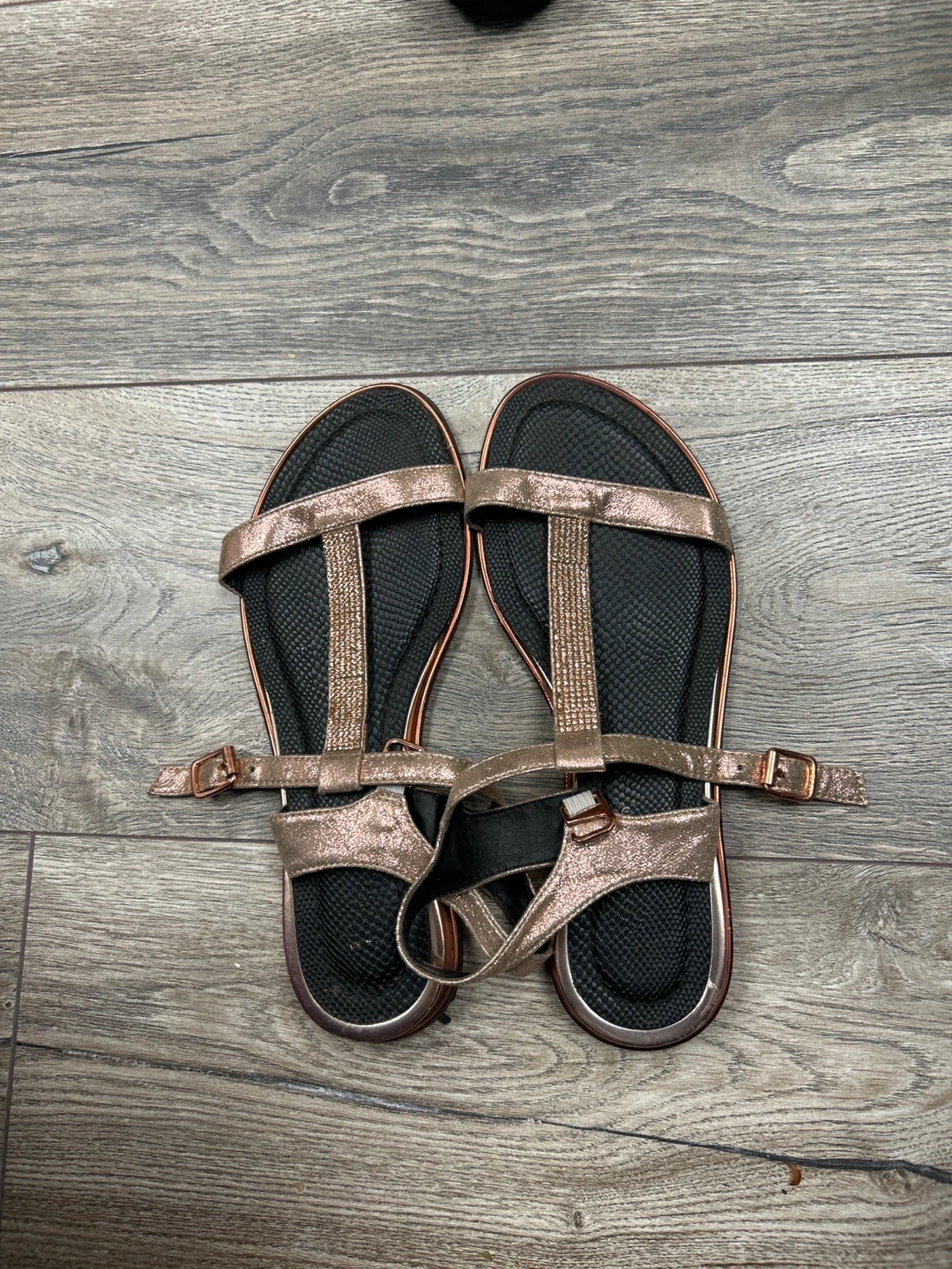These flat sandals are rose gold with black soles. They feature buckle closures. Great for casual wear in the warmer months!